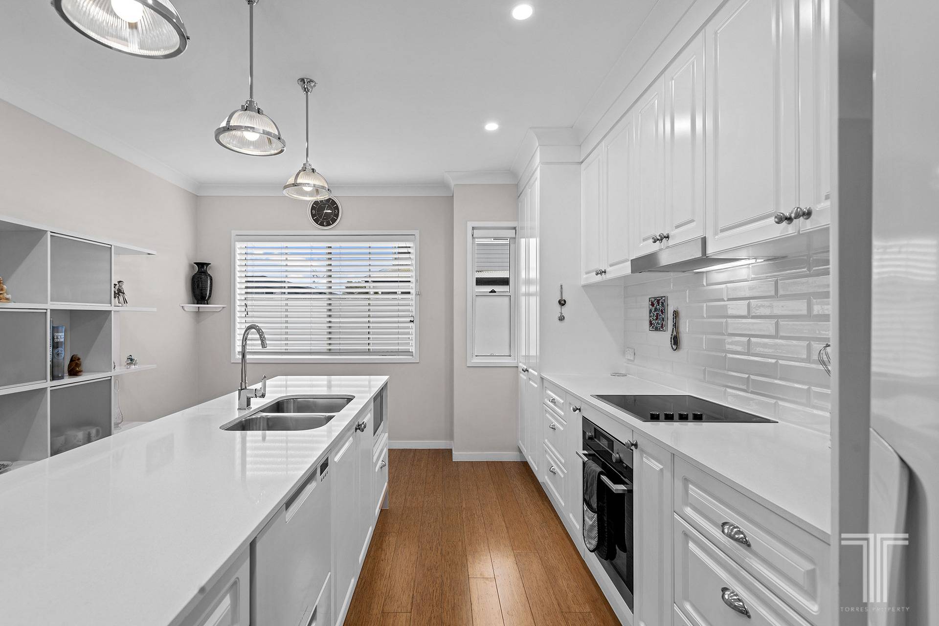 - Hamptons kitchen with pendant lights and shaker-style cabinetry