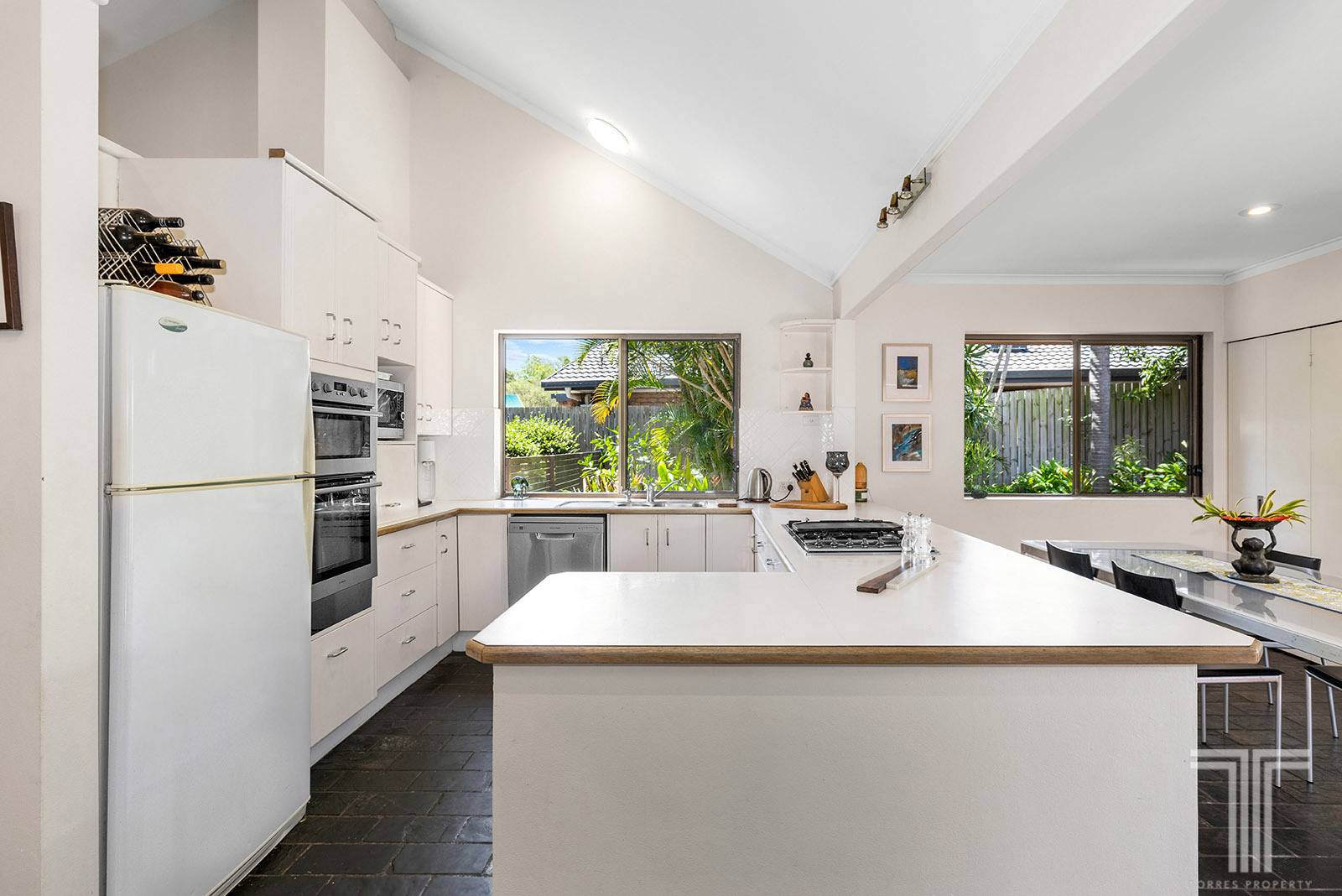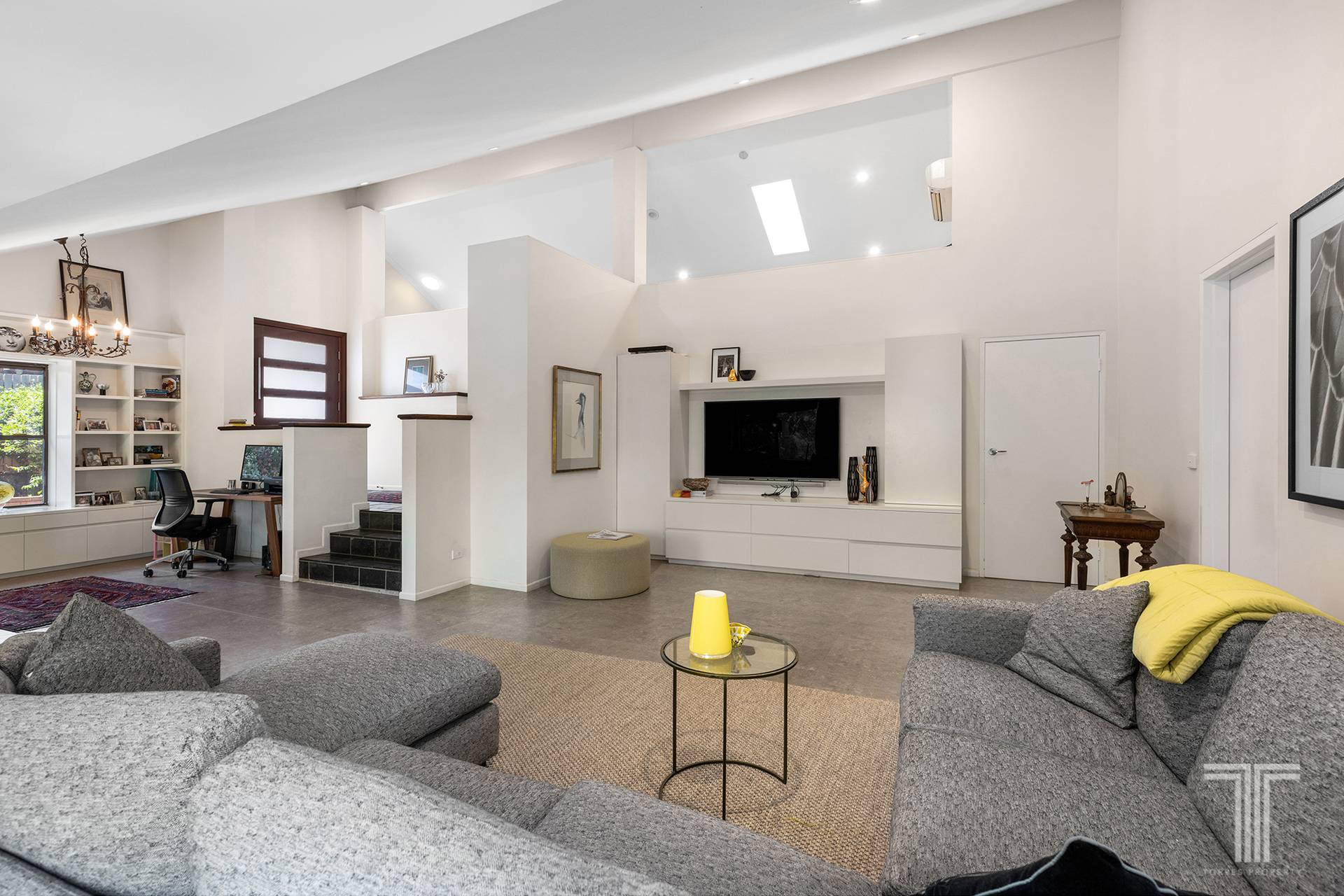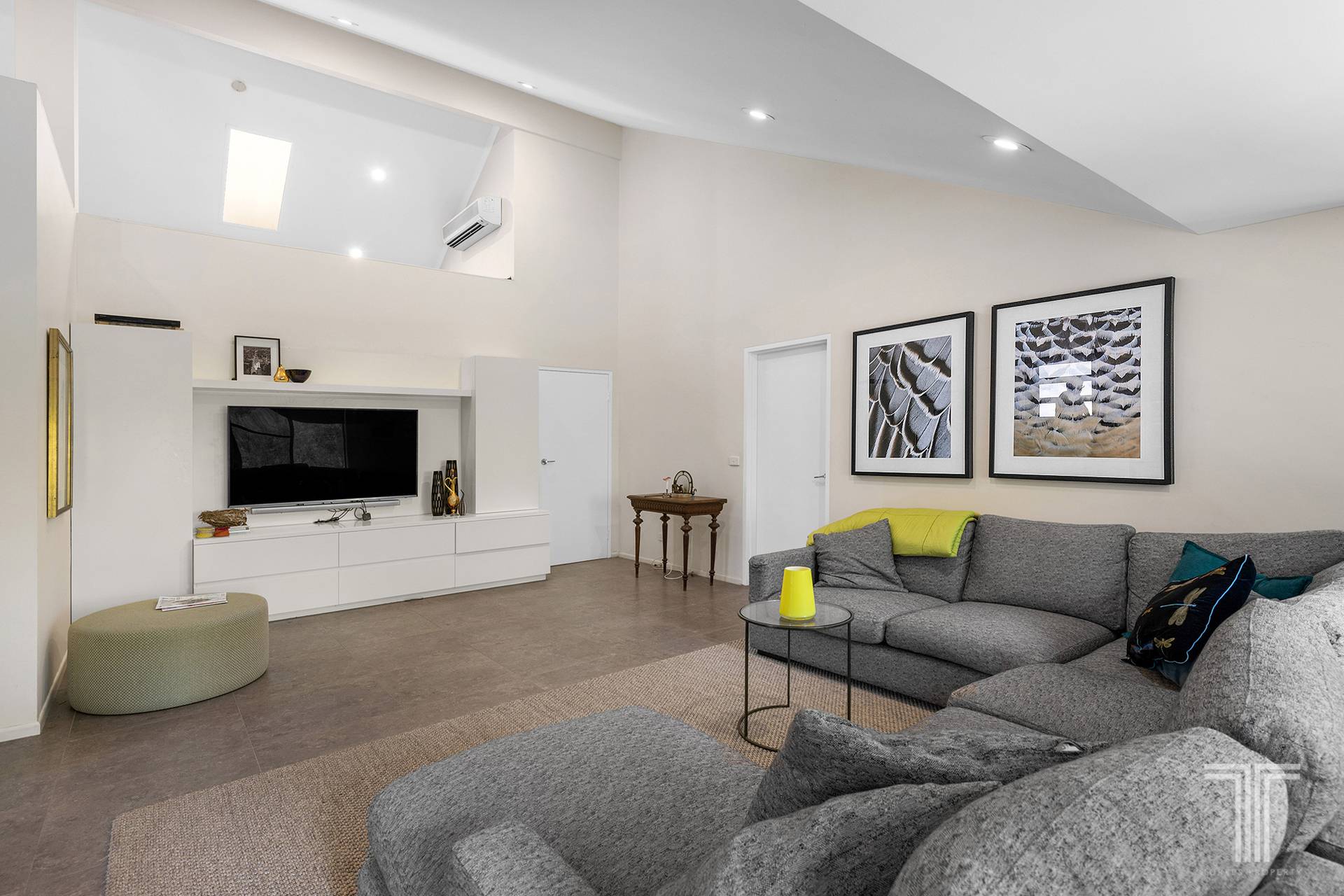 The lofty interiors create a fantastic sense of space with cathedral ceilings, a skylight, large windows and air-conditioning. The open design flows from the large living room with a study and balcony to the central lounge and dining area accompanying the family kitchen.