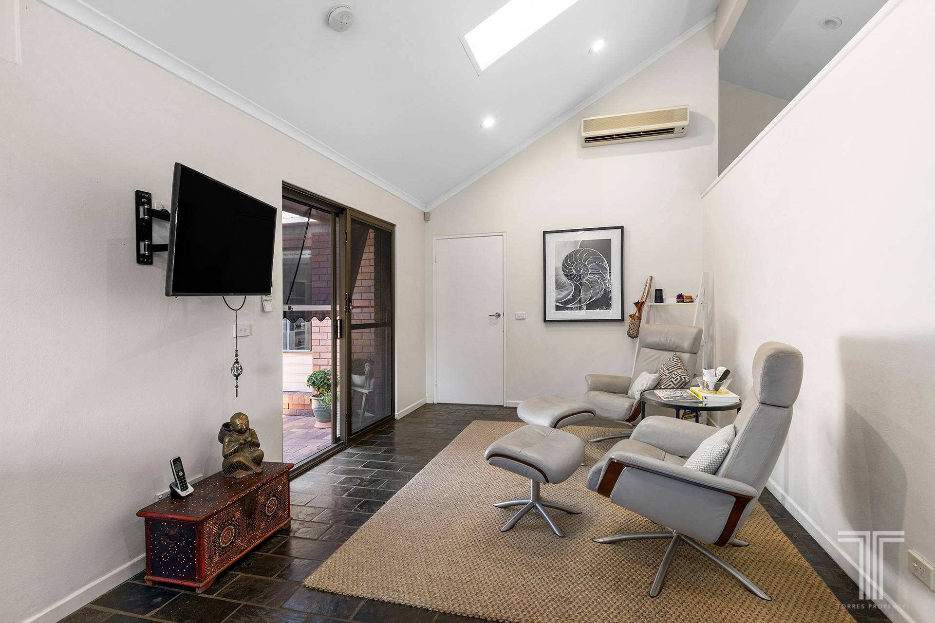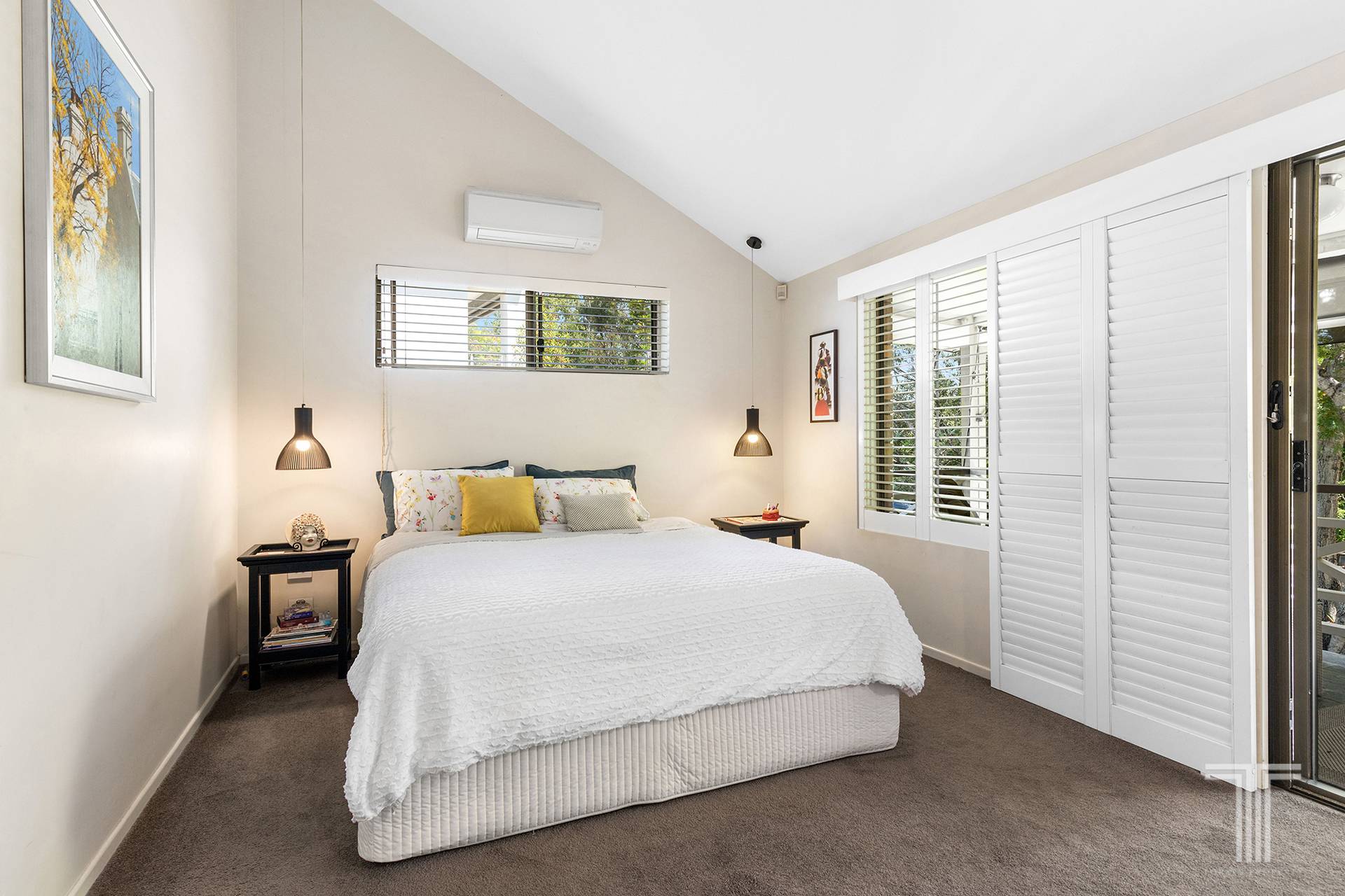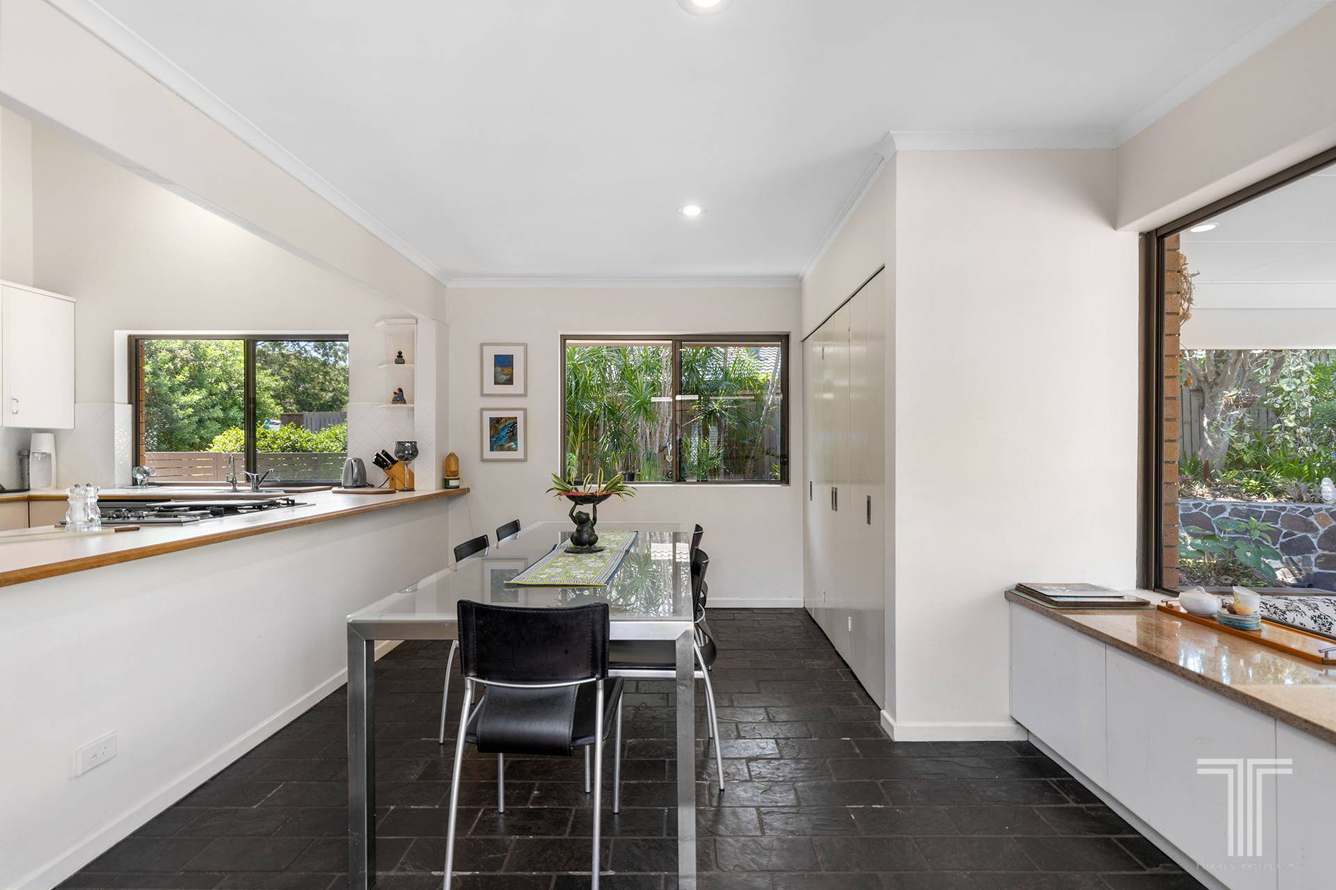 The lofty interiors create a fantastic sense of space with cathedral ceilings, a skylight, large windows and air-conditioning. The open design flows from the large living room with a study and balcony to the central lounge and dining area accompanying the family kitchen.