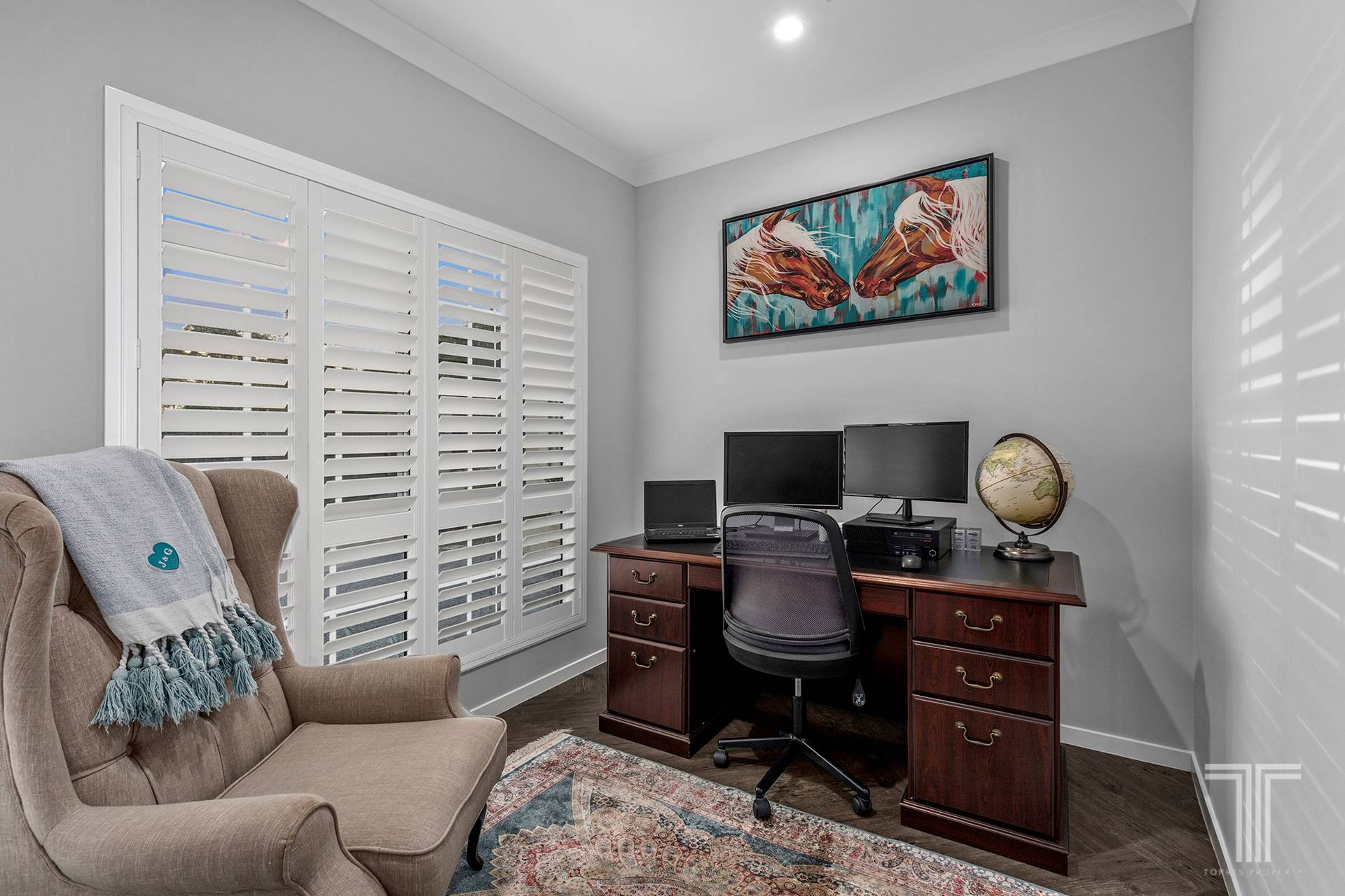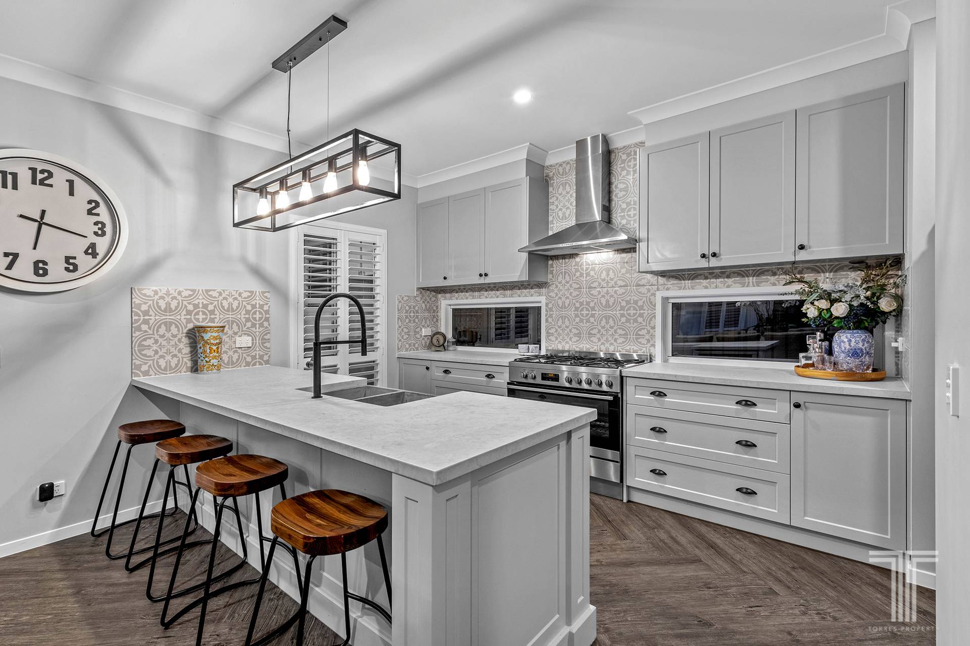Picture-perfect from the moment it comes into view, the house unveils stunning herringbone floors, carpeted bedrooms, gorgeous tiles, premium plantation shutters, and a hardwood staircase.