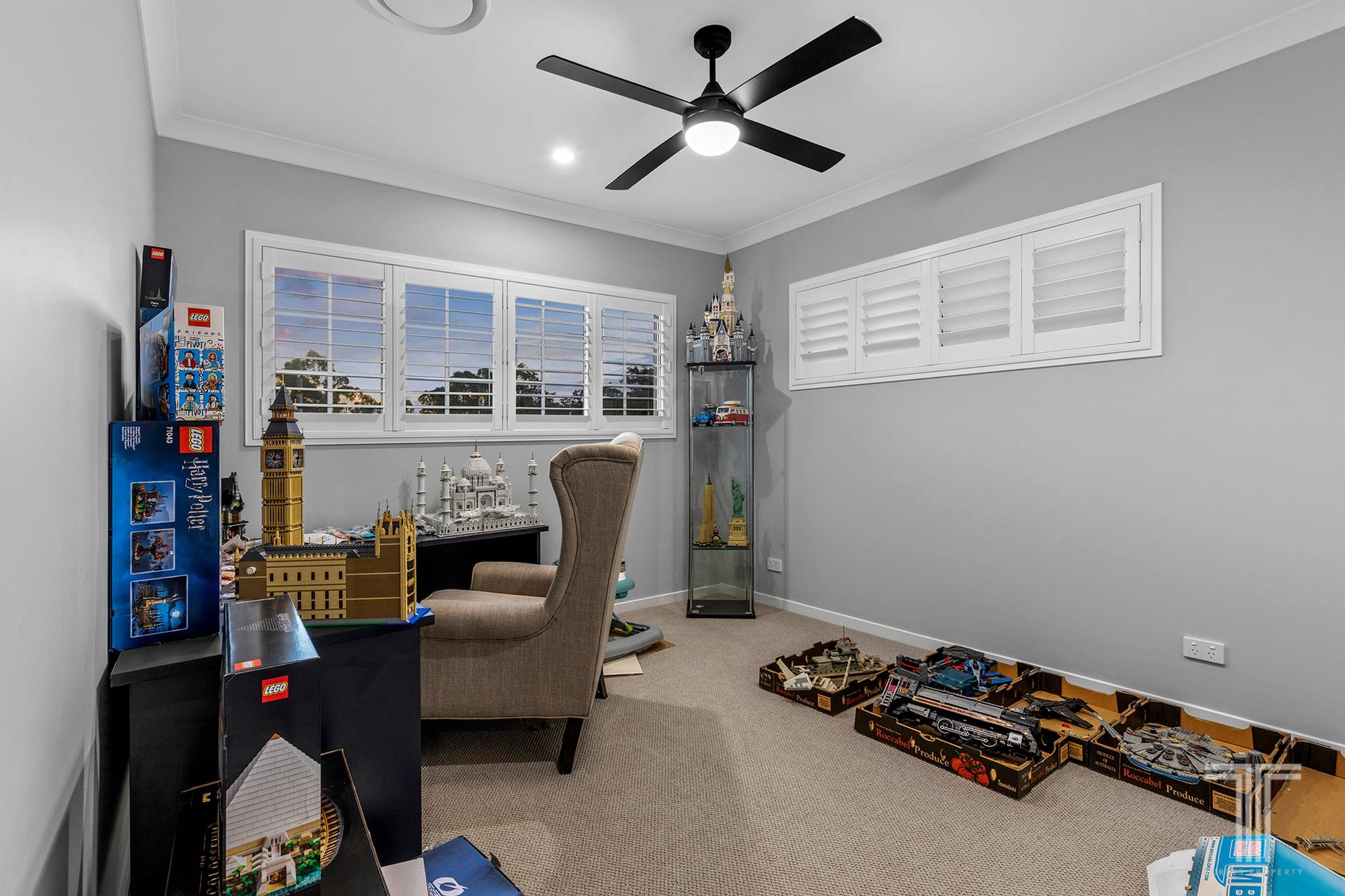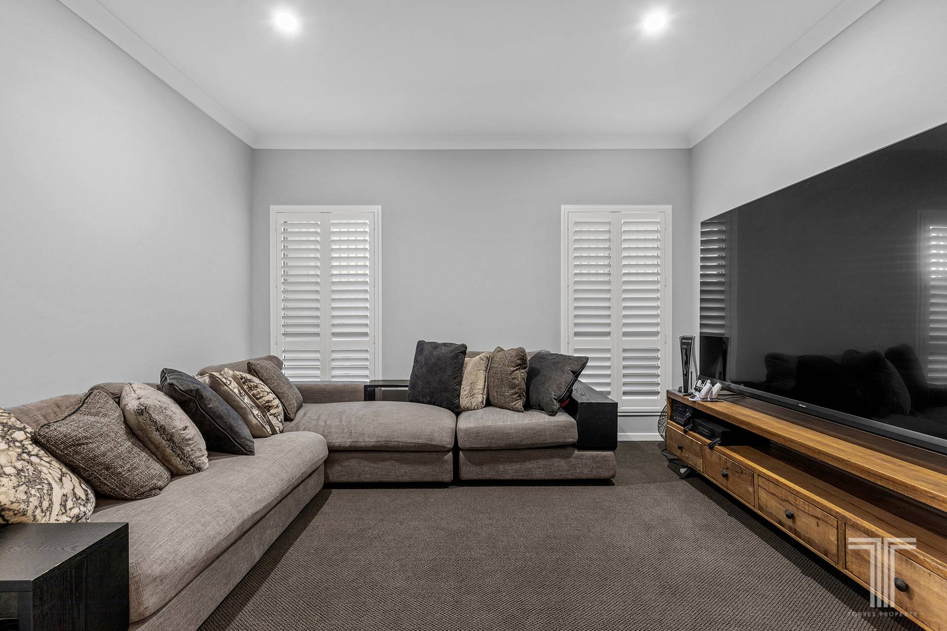 The lower level provides abundant space to relax, work and gather the family, with a free-flowing living and dining area, media room and a study. The master kitchen is a culinary haven, showcasing 40mm matte finish Caesarstone benchtops, feature tile splashbacks and an adjoining butler's pantry and laundry.