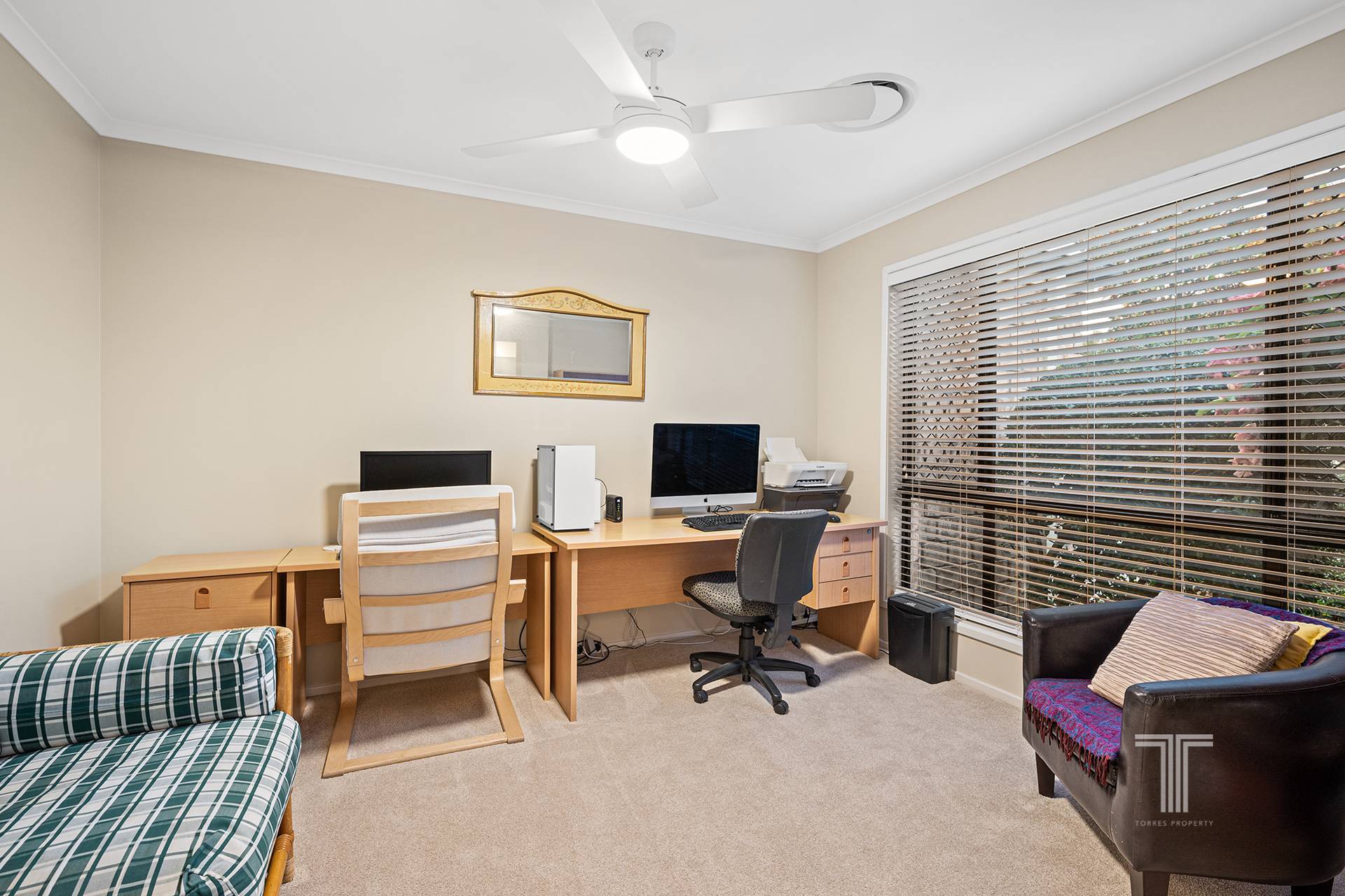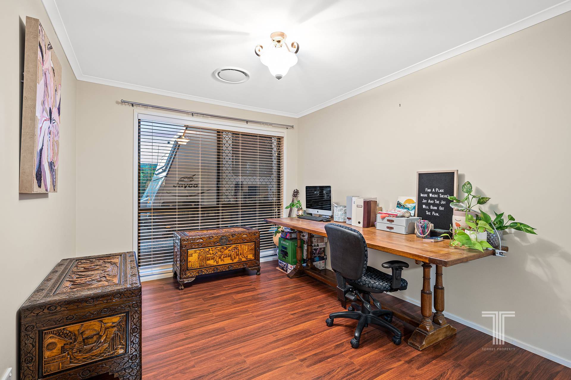 Four bedrooms and an office/study are serviced by two bathrooms. Parents can relax in the master bedroom, which features a walk-in robe, ensuite and ducted and split system air-conditioning. The additional bedrooms include built-in robes and access to the family bathroom, featuring a bathtub, separate toilet and adjacent laundry.