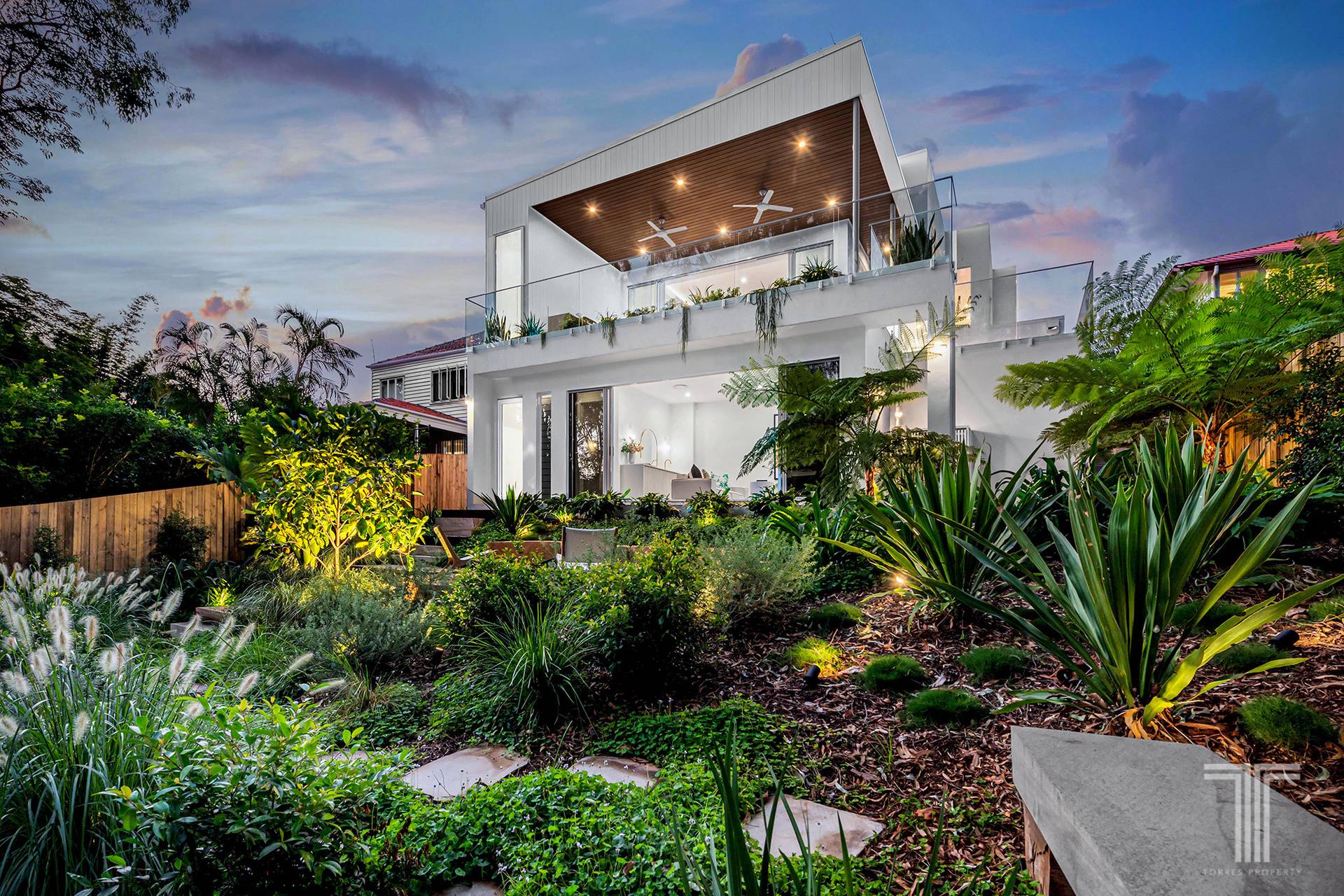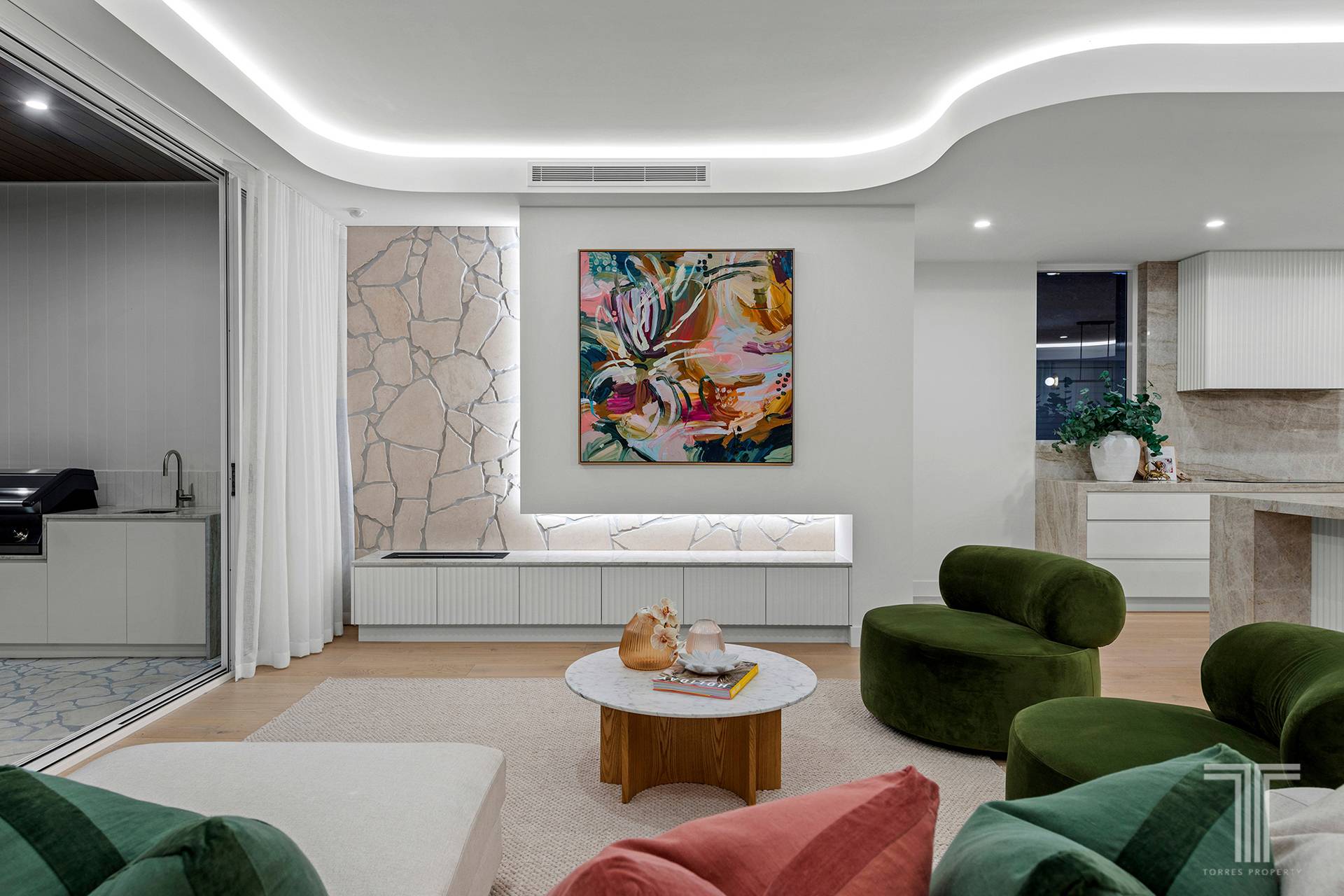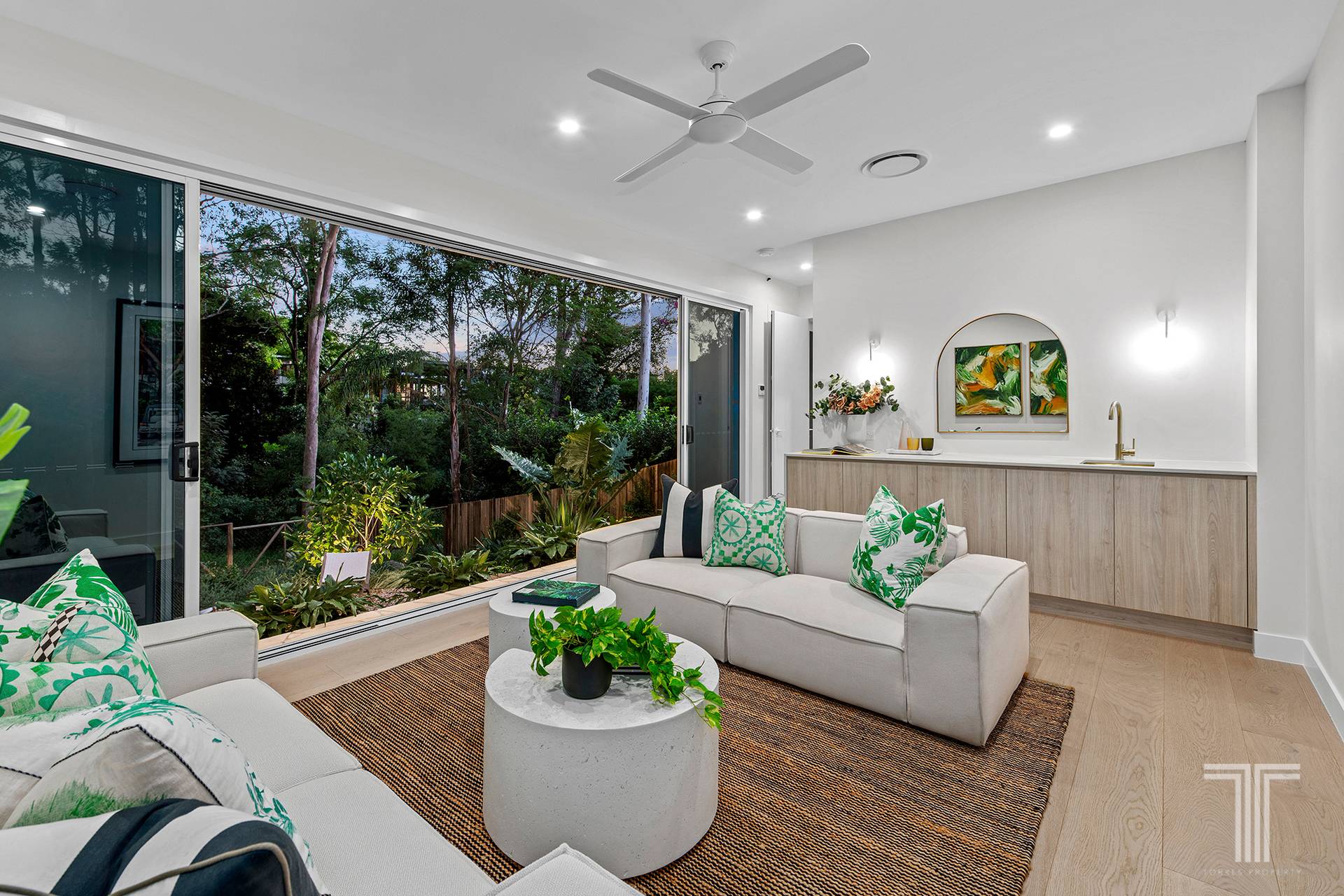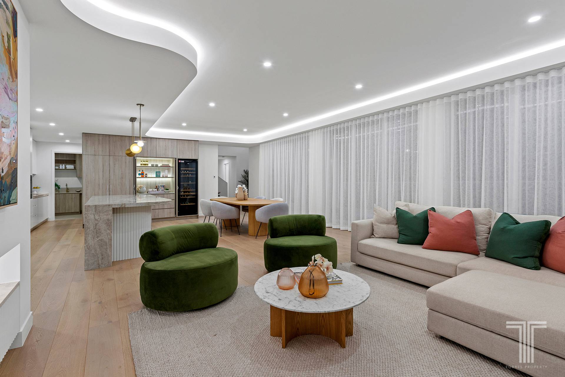 Multiple living spaces are upstairs, separated by a soaring 6m void. A fourth living area with a wet bar is below, opening to a garden retreat. Featuring a bathroom and private entry, the downstairs space will also suit a gym or office.