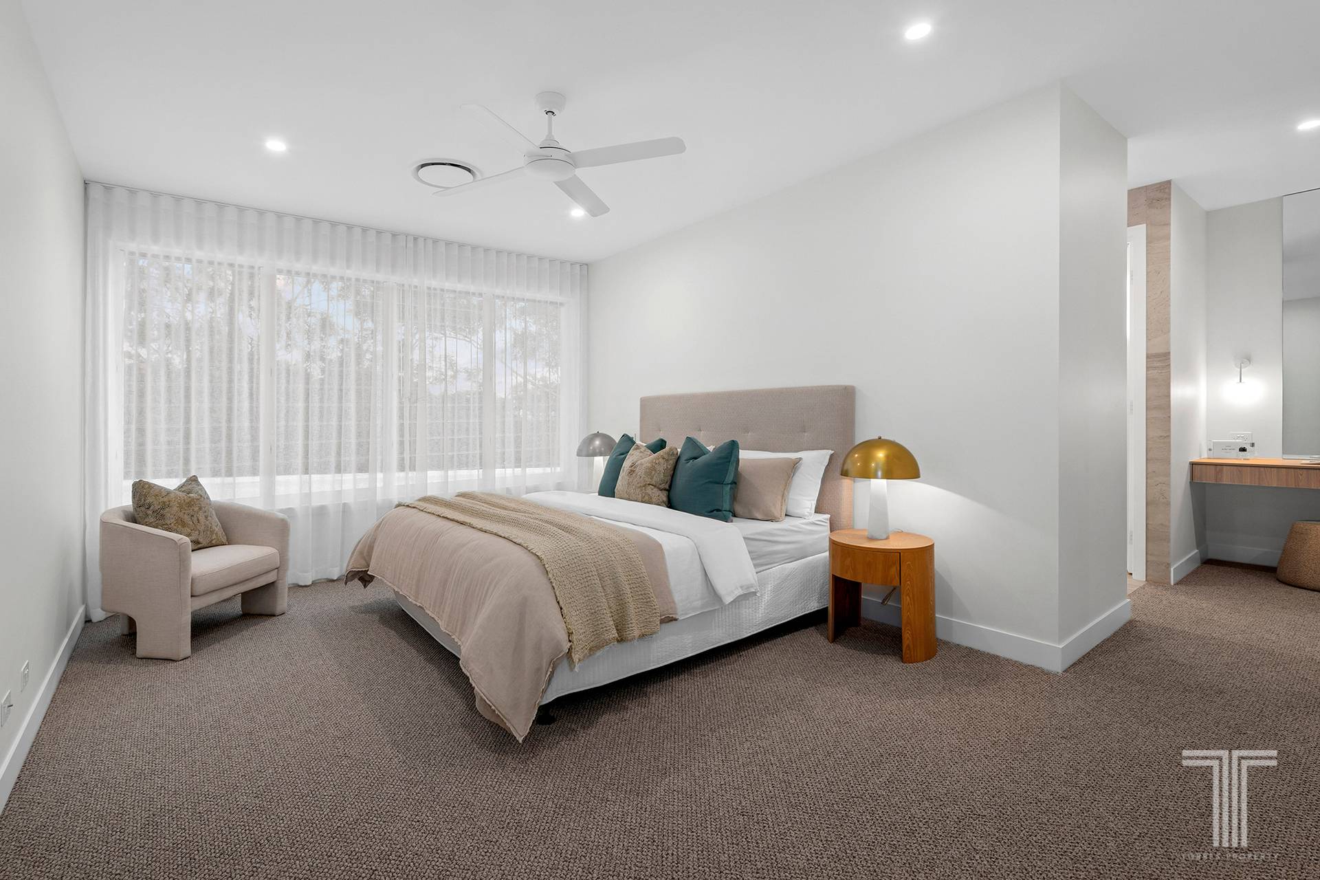Five bedrooms are positioned over two levels and serviced by five stunning bathrooms. The master gazes across the greenery and reveals a walk-in robe, make-up vanity and a lavish ensuite with a fluted bath, dual vanities, and double wall and rainfall showers.