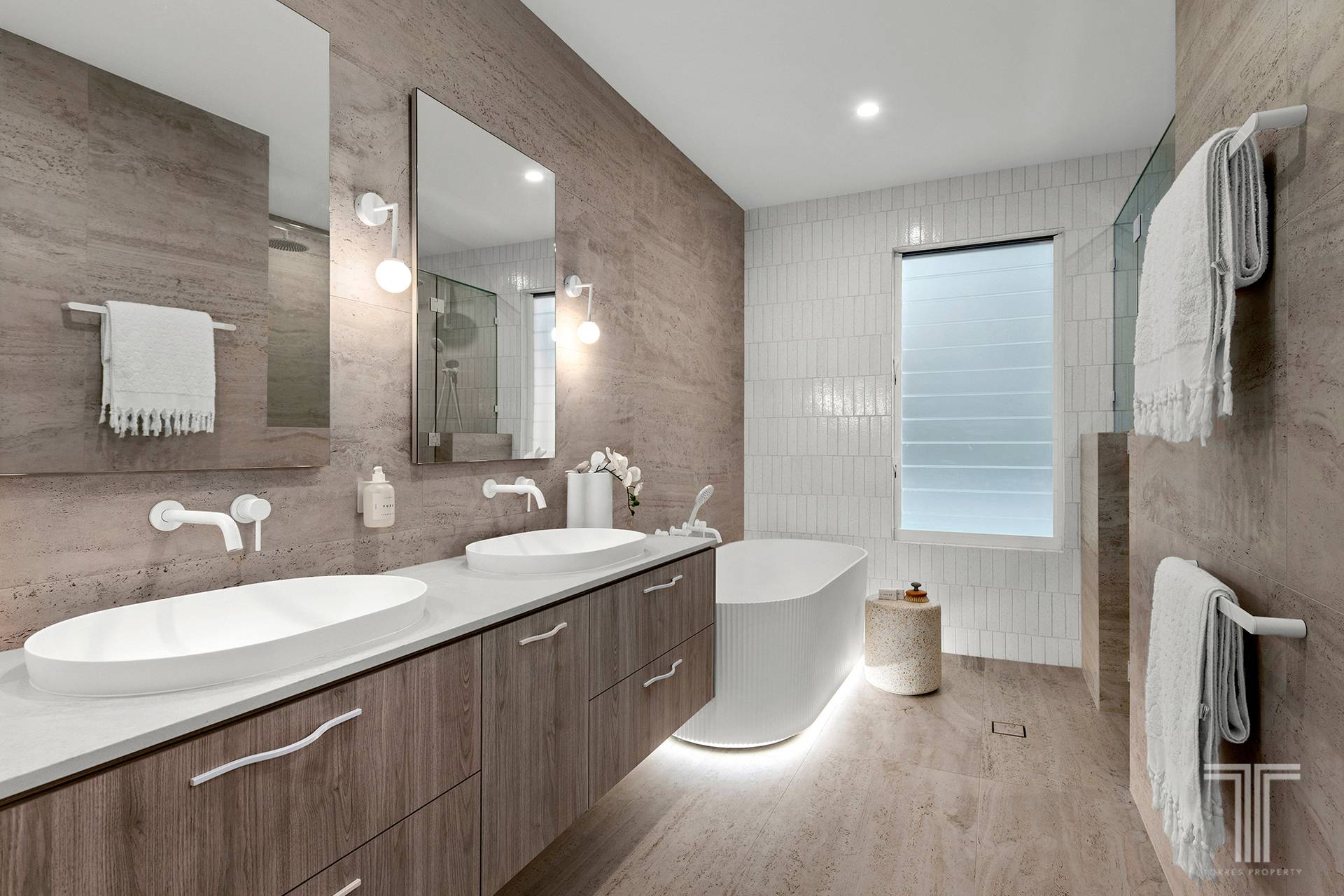 - 'Palm Beach' flooring; Taj Mahal quartzite benchtops; Croatian Limestone outdoors