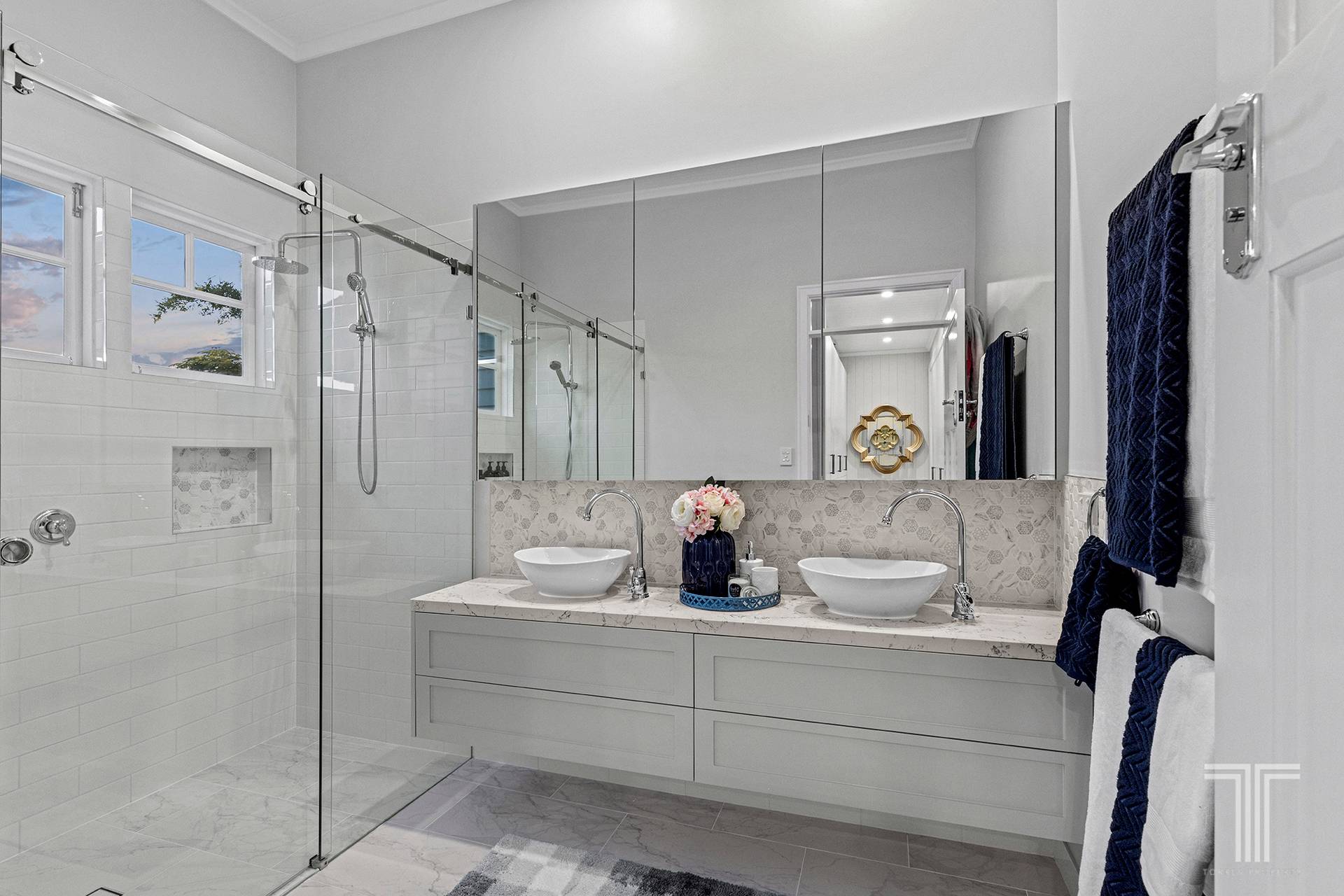 A second living area upstairs provides family separation, and two balconies extend off the upstairs bedrooms. A study, five bedrooms, three luxury bathrooms and a powder room are positioned over two floors. Two bedrooms boast ensuites, including the lavish master revealing a private balcony, a bay window seat, a luxe walk-in robe and an opulent ensuite with dual vanities and double showers. The fifth bedroom also includes an ensuite and private entry via the covered porch.
