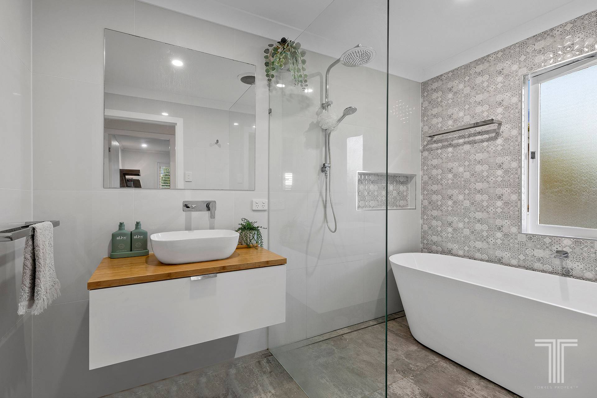 A garage, laundry and storage area are also positioned downstairs. There are three bedrooms upstairs, all with built-in robes, and the luxurious bathroom unveils sleek floor-to-ceiling tiles, a floating vanity, a relaxing rainfall shower and a freestanding bathtub.