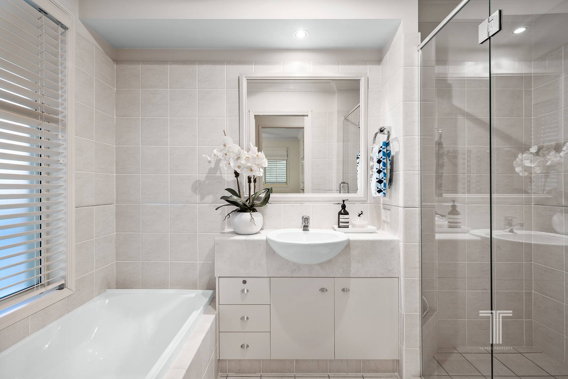 The house provides great separation with three bedrooms and two bathrooms upstairs, plus a study and powder room below. All the bedrooms feature built-in robes and shutters, and the master includes an ensuite with a skylight, spa bath and dual vanities. The main bathroom also features a bathtub and a separate toilet, and the downstairs laundry accesses the double garage.