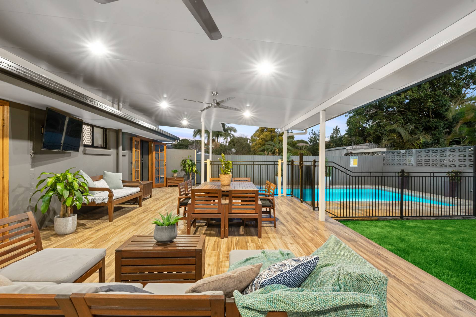 An alfresco oasis destined to delight, the oversized rear entertaining area has been expertly crafted to embrace the Queensland climate and lifestyle. With abundant living, dining and relaxation space, you can enjoy exceptional hosting by the grassy yard and glistening pool.