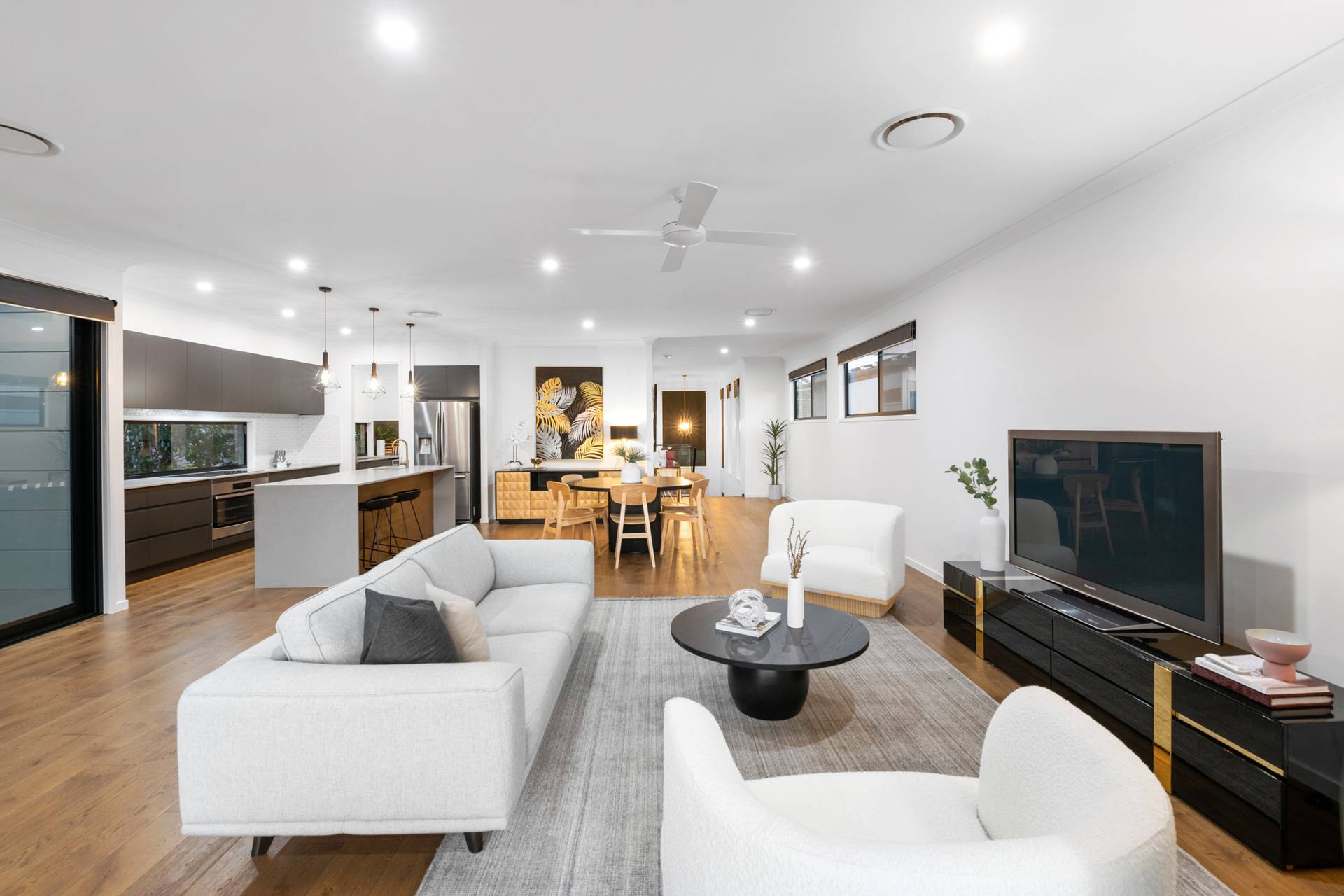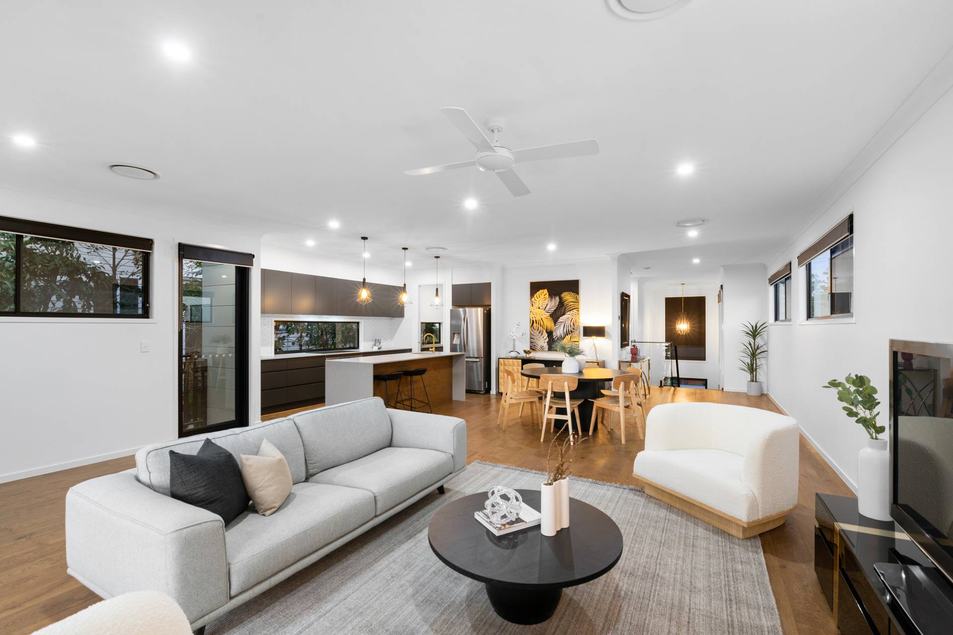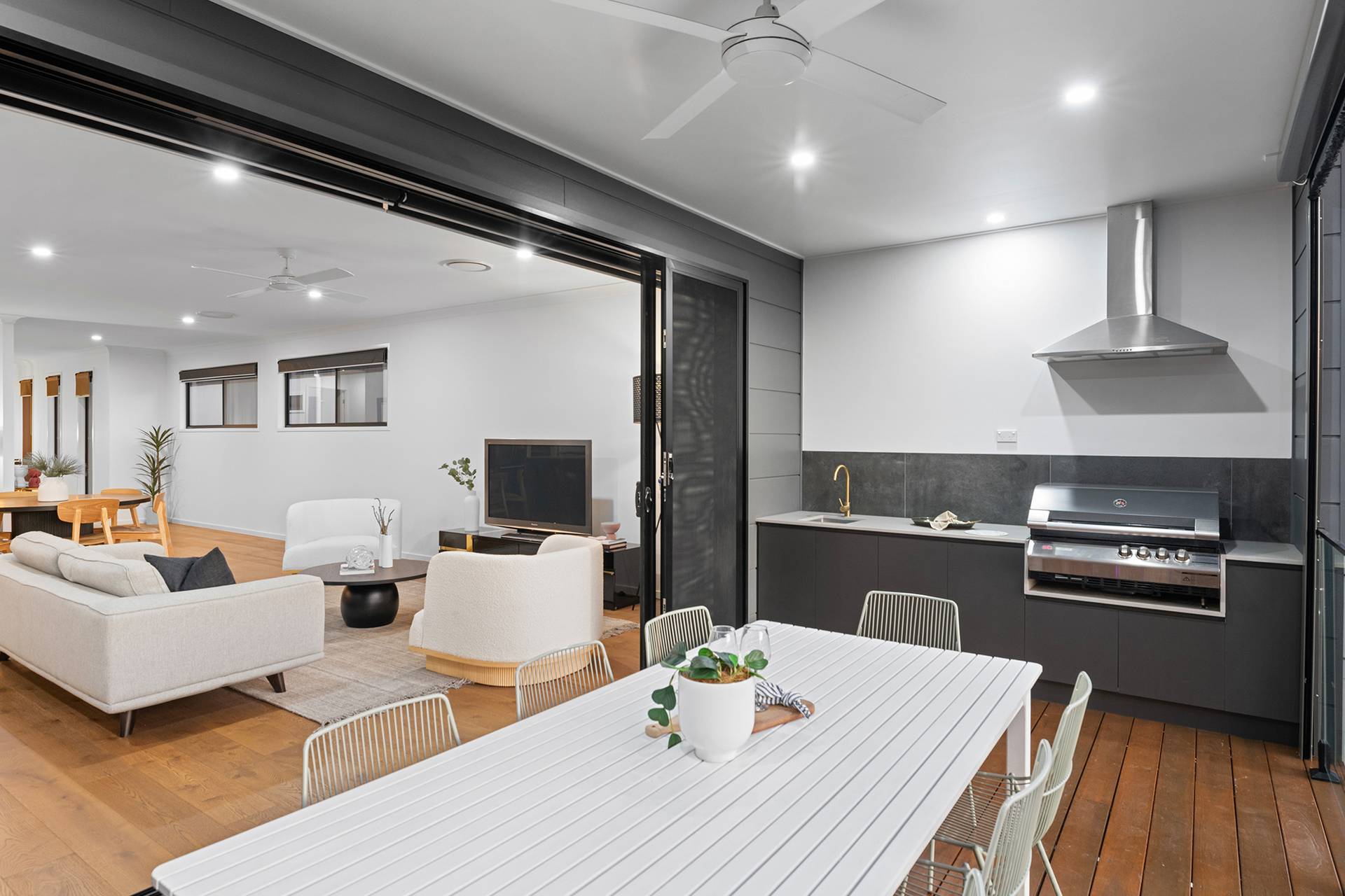 The upstairs living area forms a haven of sophistication with its open design and seamless connection to the chef's kitchen, featuring a waterfall island, butler's pantry and Westinghouse appliances. The culinary excellence continues on the balcony, showcasing scenic hillside views, mesmerising sunsets and an outdoor kitchen for alfresco dining.