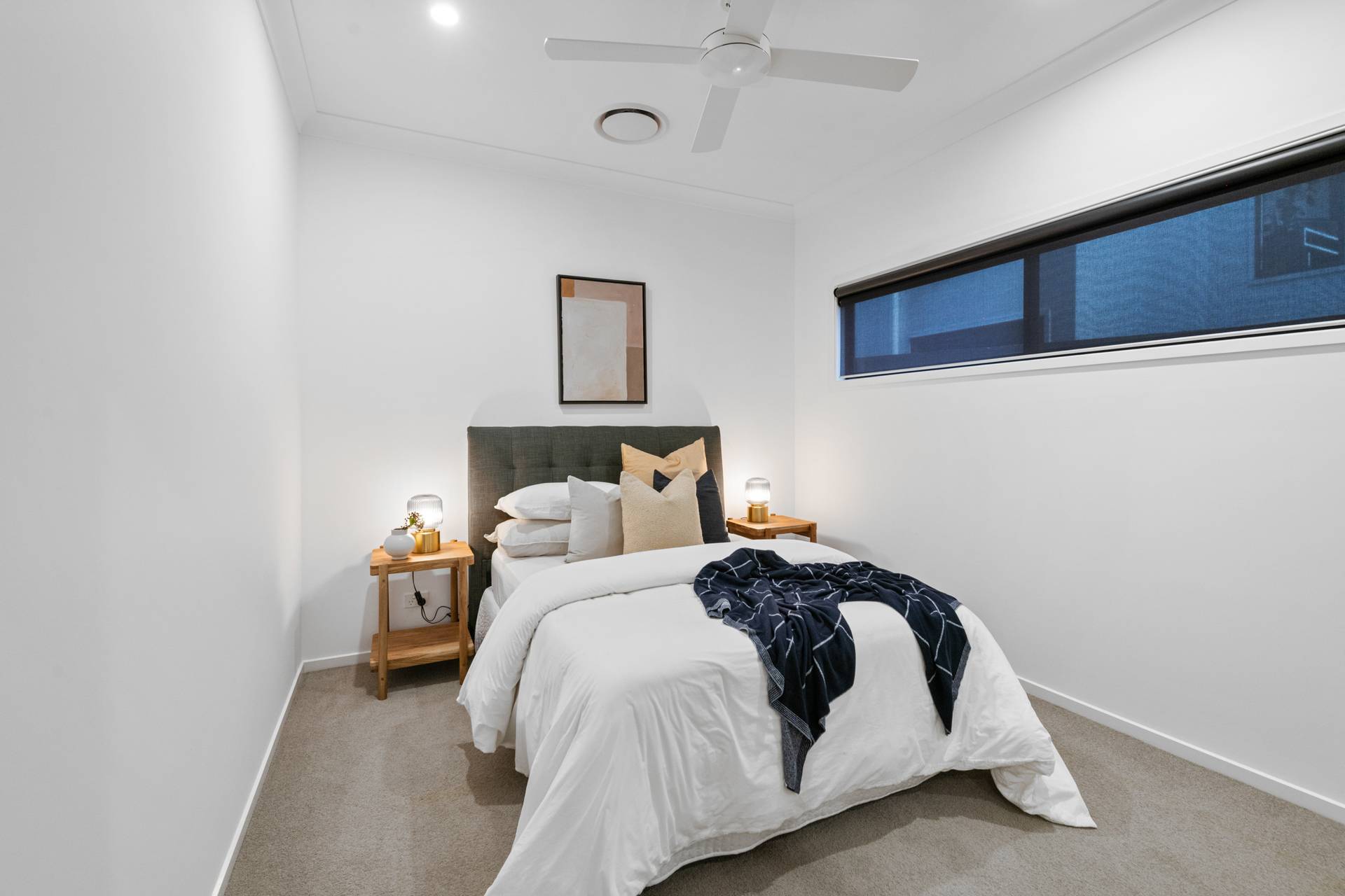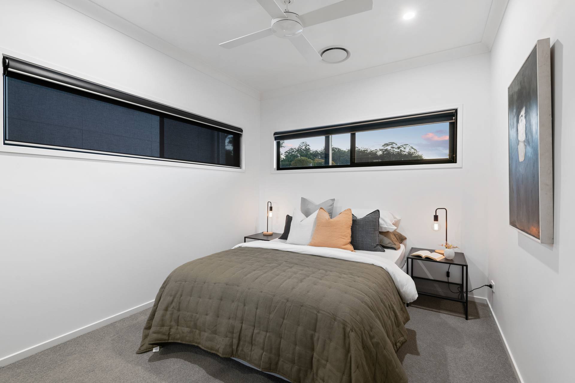 Four bedrooms share access to two luxurious bathrooms with dual vanities and rainfall showers, two powder rooms, and a double garage with storage. The master suite offers separation on the upper floor with a private balcony, walk-in robe and ensuite. The other bedrooms reside downstairs by the study nook, laundry and main bathroom.