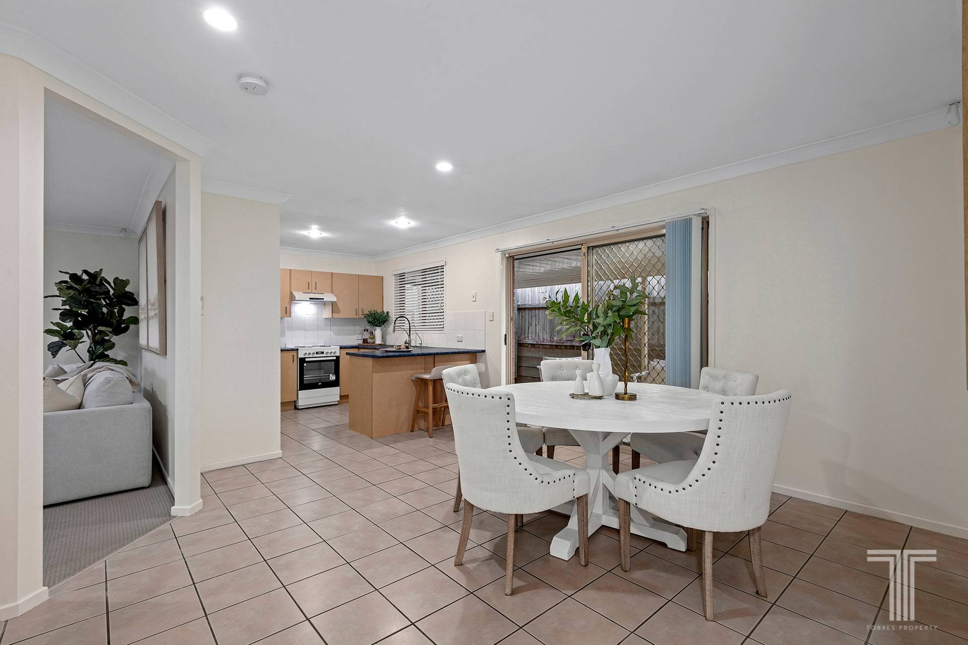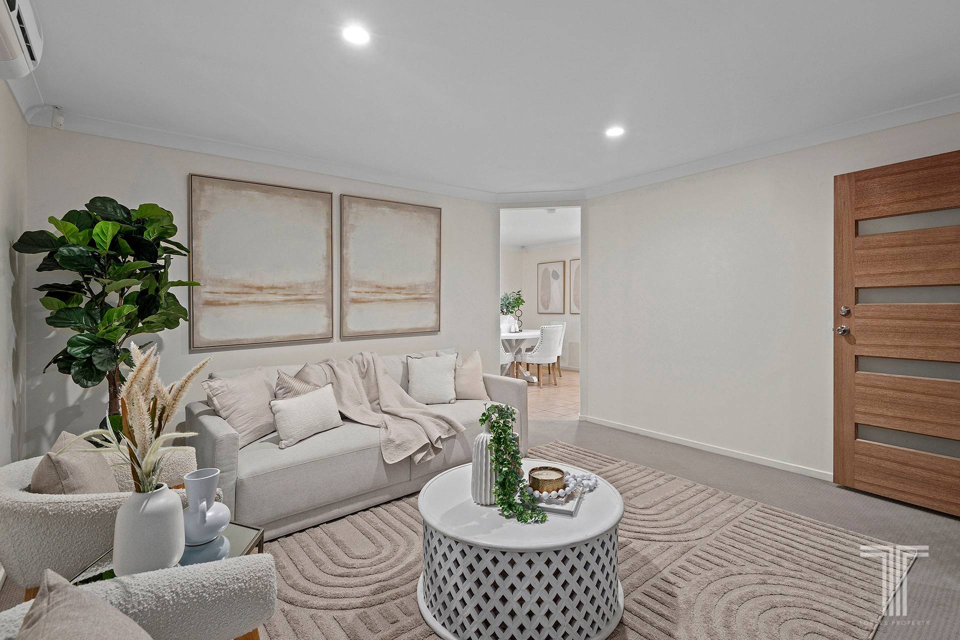 The modern kitchen has ample cupboards and bench-space, and water purifier. Presenting an easy flow floorpan that connects into the dining and the outdoor entertaining patio via the glass sliding doors, and into the fenced spacious yard.