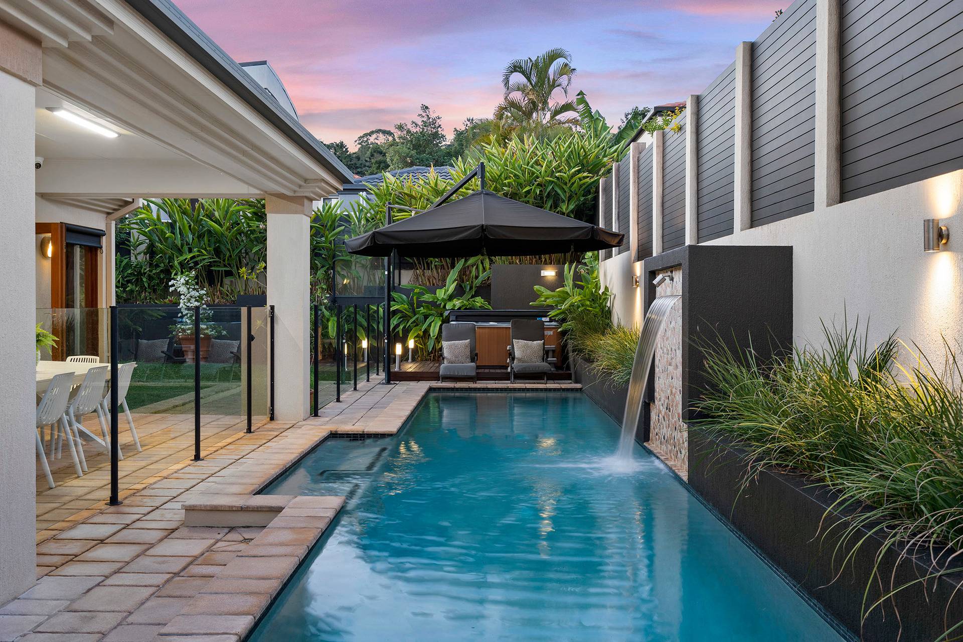 Transport yourself to an island escape on the alfresco entertaining area, boasting a peaceful patio, lush lawns and a lounging space by the 15m swimming pool, water feature and spa.