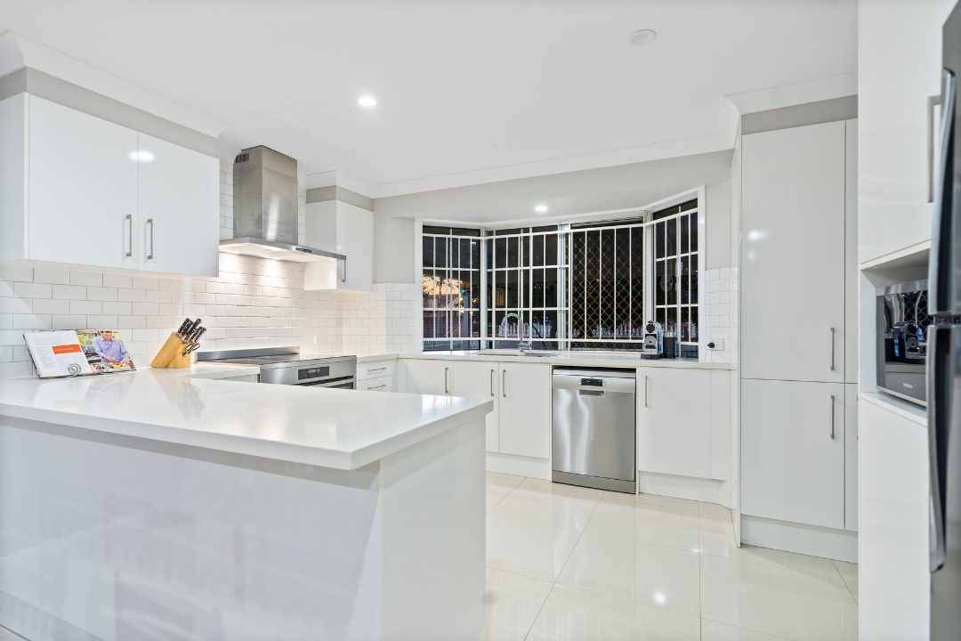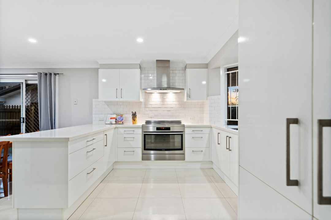 Stylish well-appointed kitchen with crisp white cabinetry and caesar stone bench tops, ample storage, quality appliances and stunning subway tile splash back.