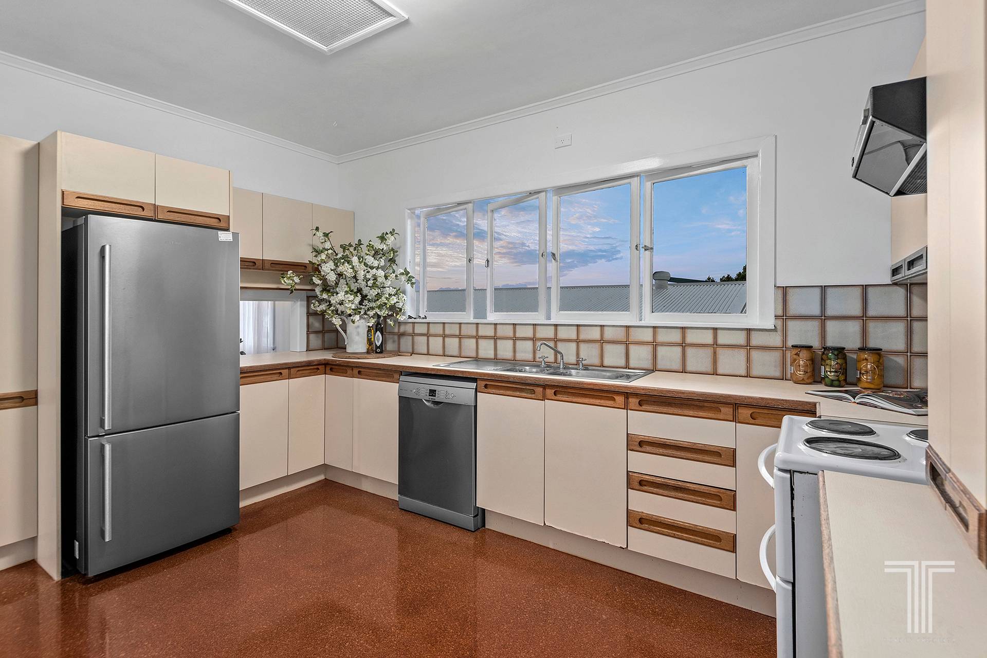 An original kitchen connects the separate living zones and ensures easy meal preparation with its light-filled design, servery window, excellent storage and stainless steel dishwasher.