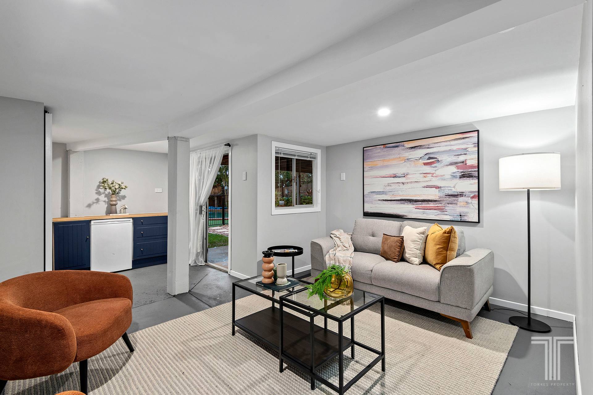Providing family comfort, three bedrooms with built-in robes, a study, a renovated bathroom with a rainfall shower, and a carport feature upstairs. A multipurpose room on the ground floor boasts separate entry, a kitchenette/bar, bathroom, and laundry, offering an excellent retreat or breakout space.