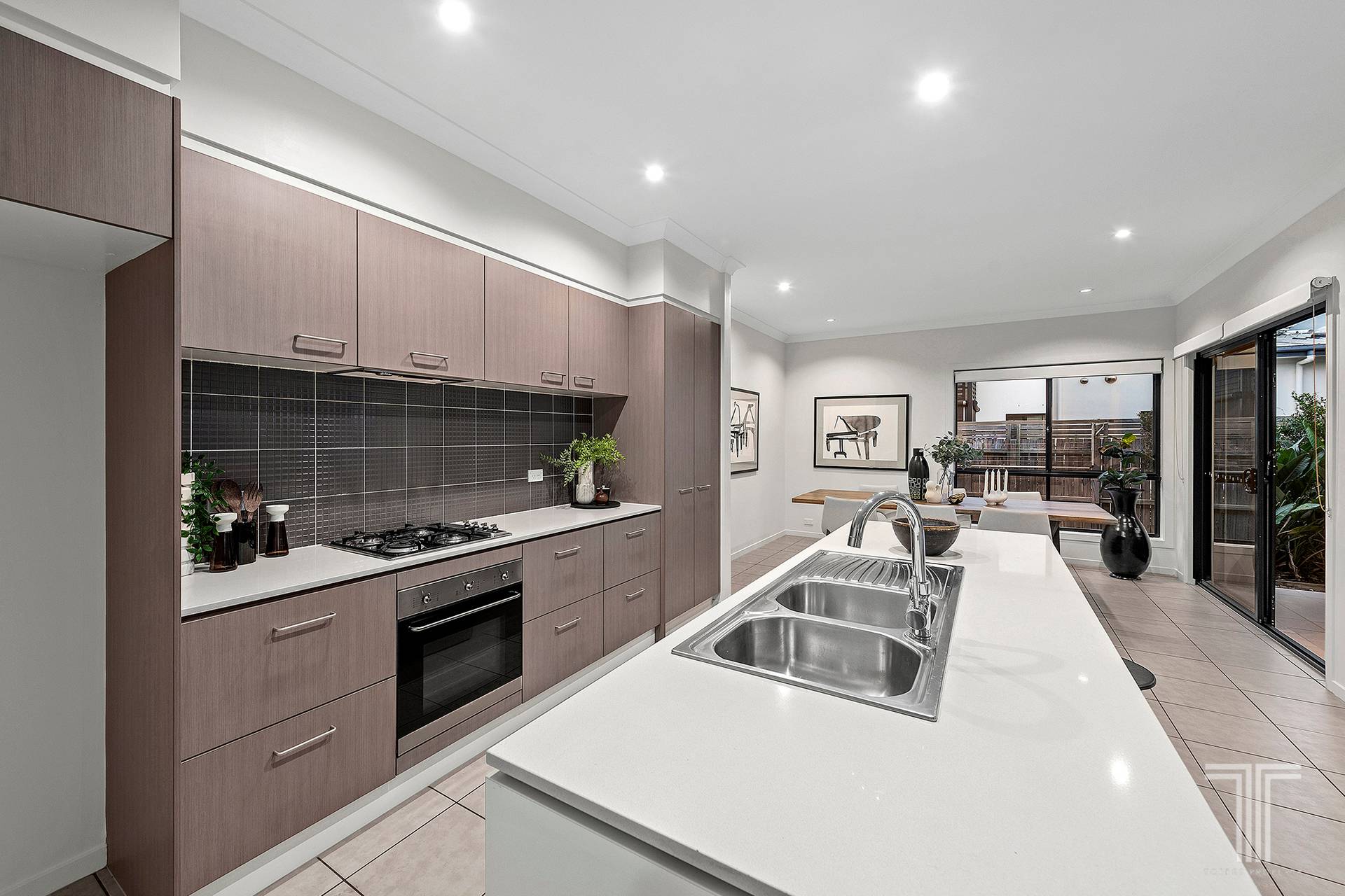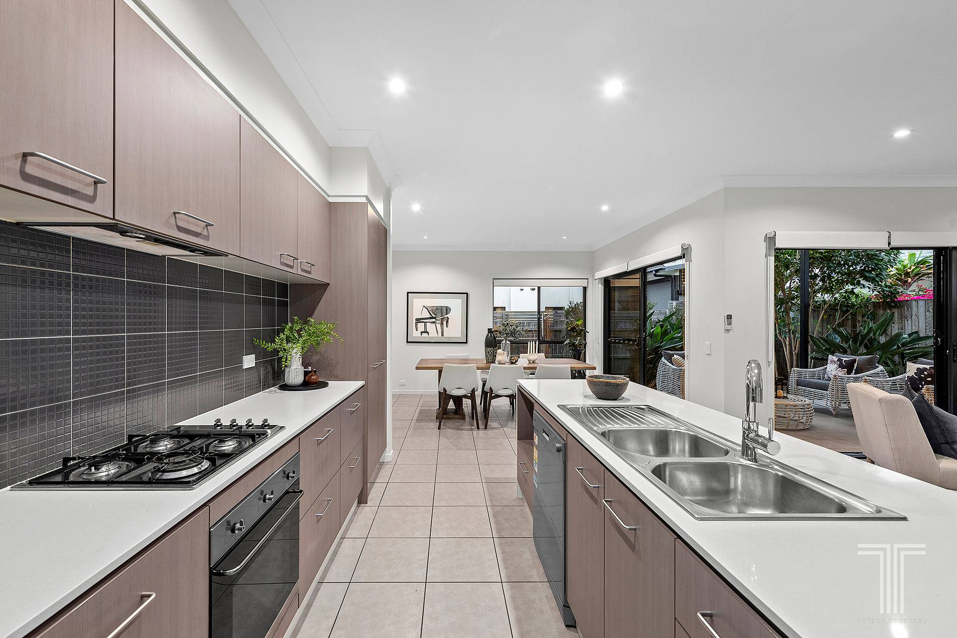 Shared meals can be enjoyed in the air-conditioned living and dining area, which reveals an open and well-arranged layout that encompasses the central kitchen featuring spacious stone benchtops, stainless steel appliances, and a gas cooktop.