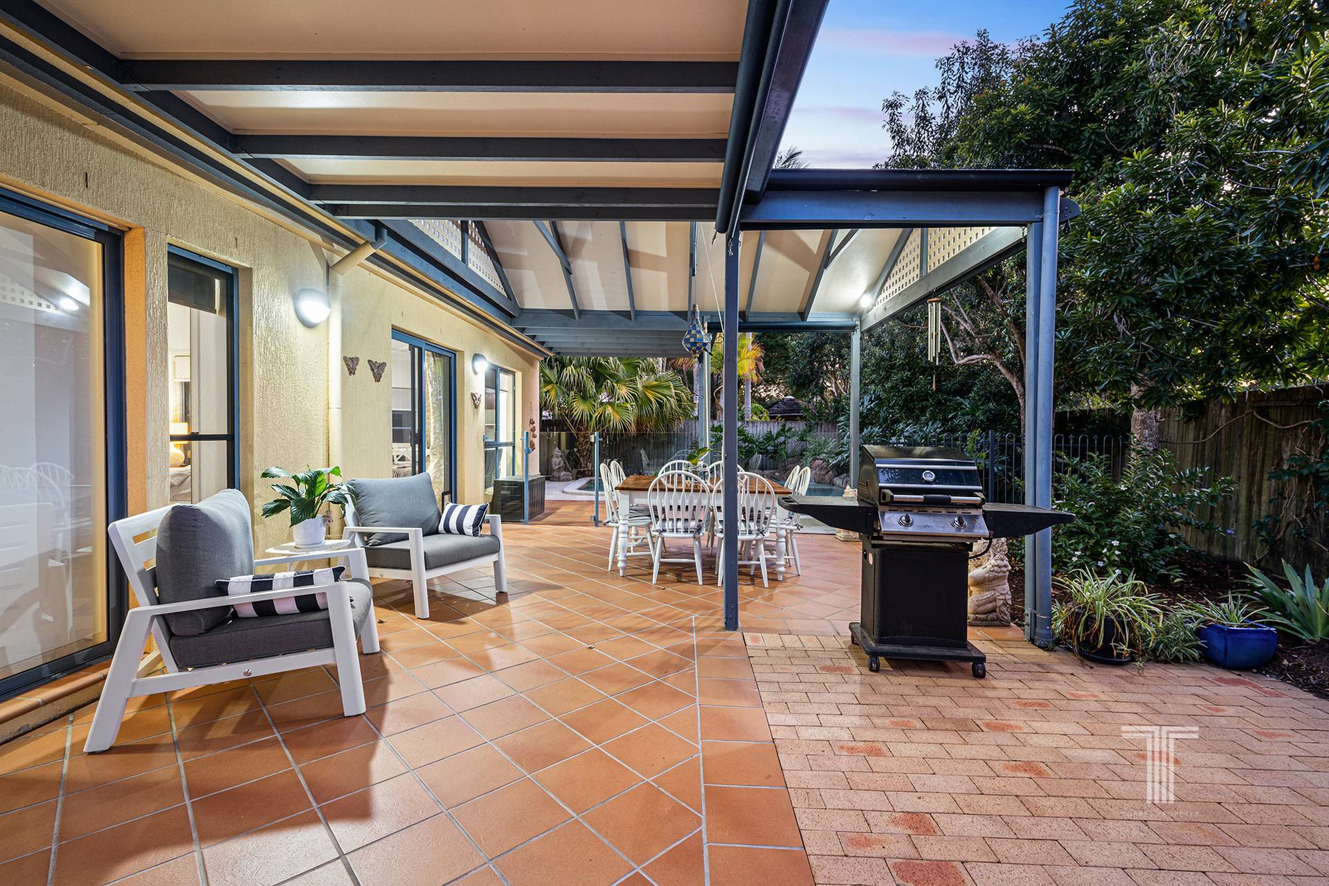 Back downstairs and outdoors, you'll discover an entertainer's dream. Picture summer days where friends and family gather on the paved alfresco, and kids splash in the inground pool, heated for year-round enjoyment by solar panels.