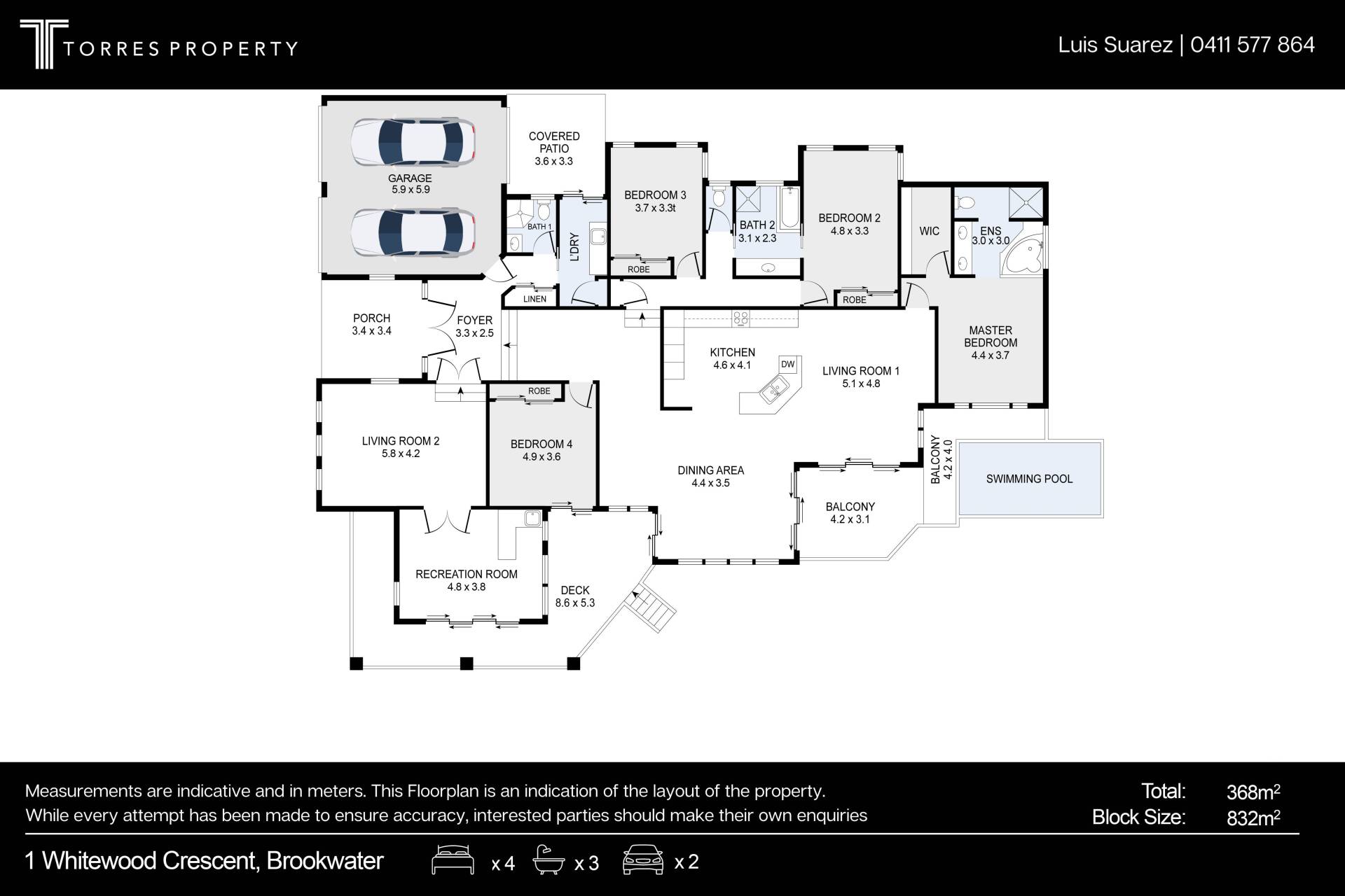 4 Beds 3 Baths 2 Cars 832 m2