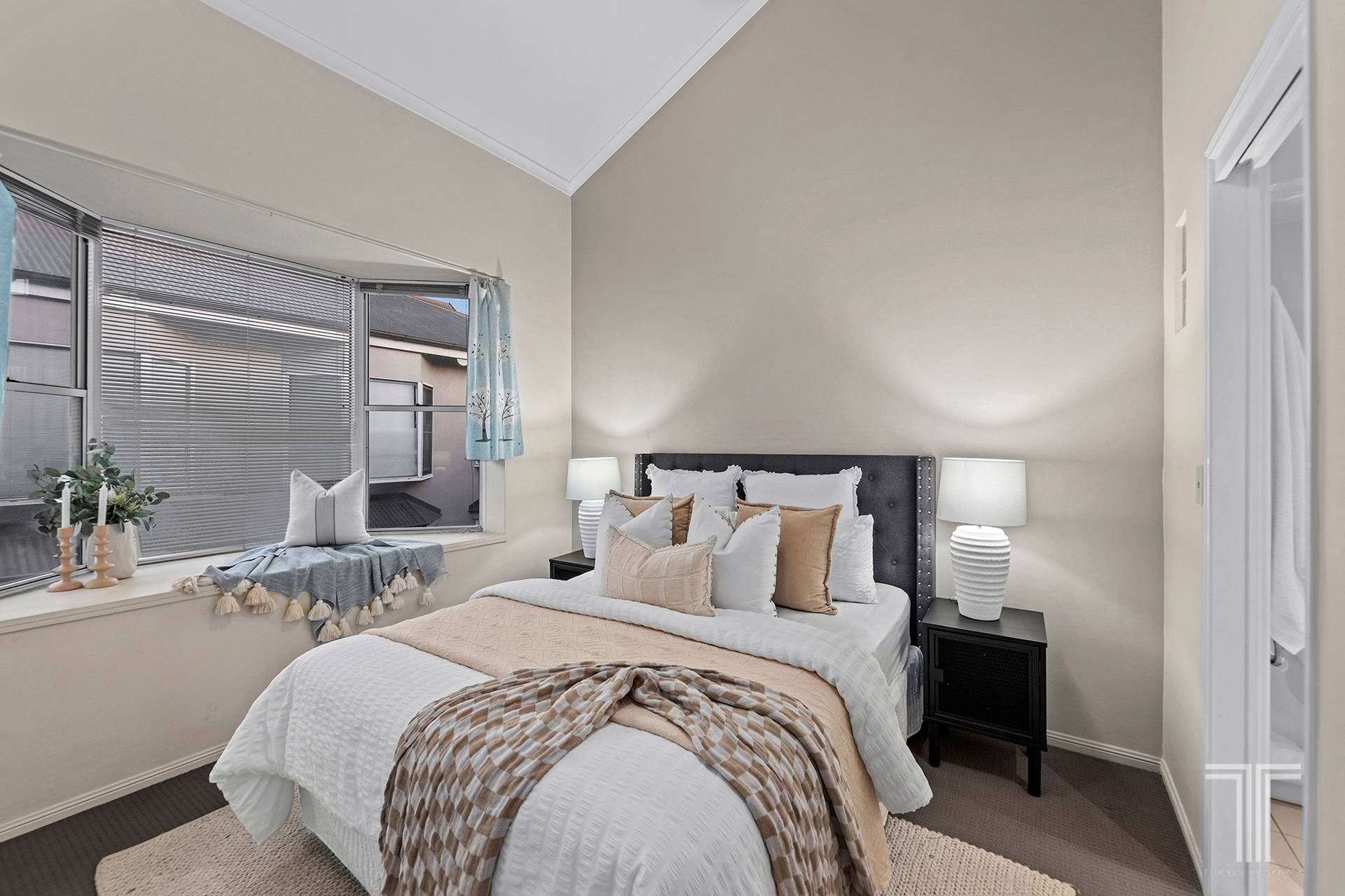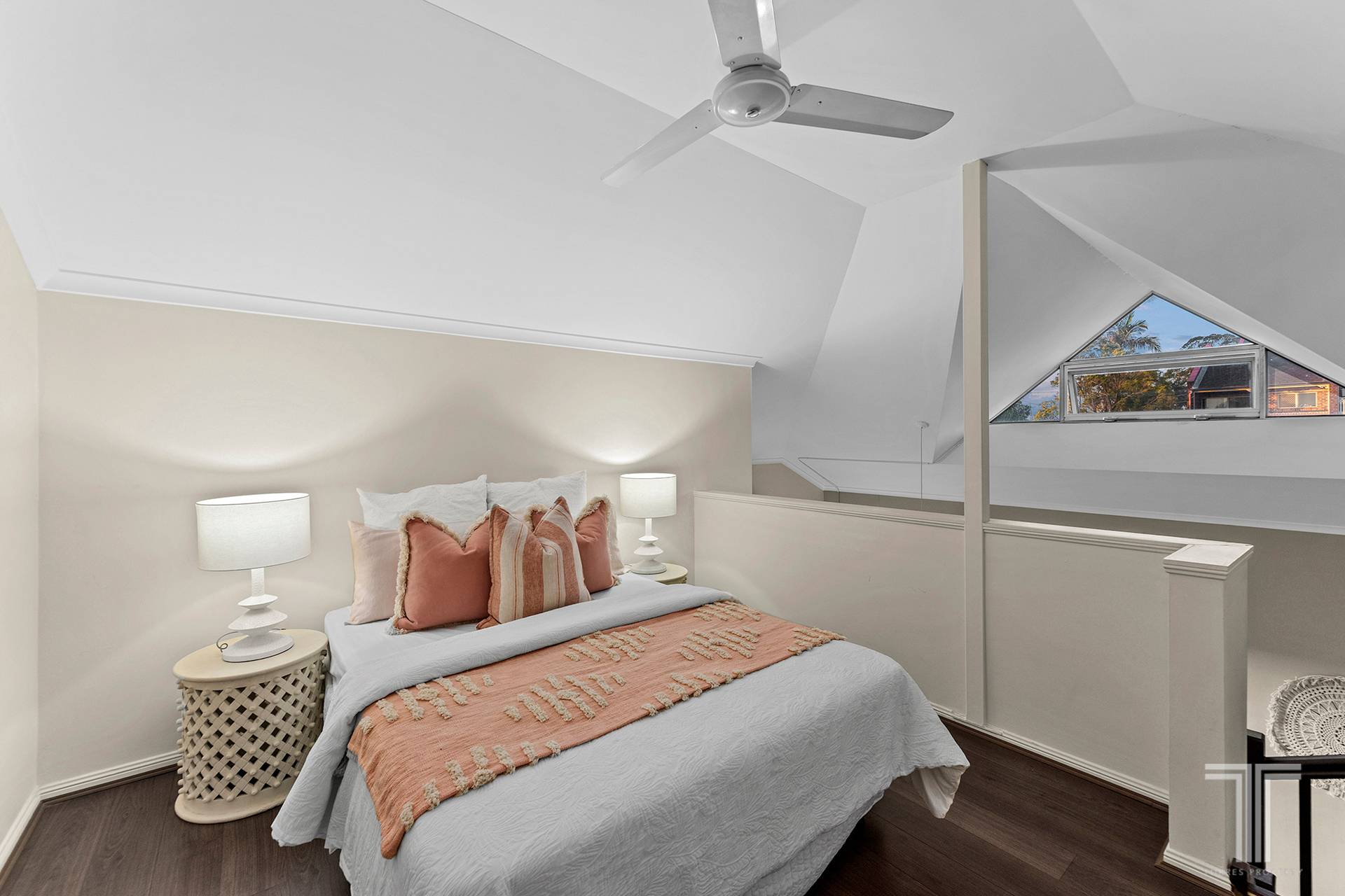 Two bedrooms with quaint bay window seats and spacious built-in robes feature on the main floor, including a master with an ensuite. A third loft bedroom resides upstairs, offering privacy and alternate use as a workspace.