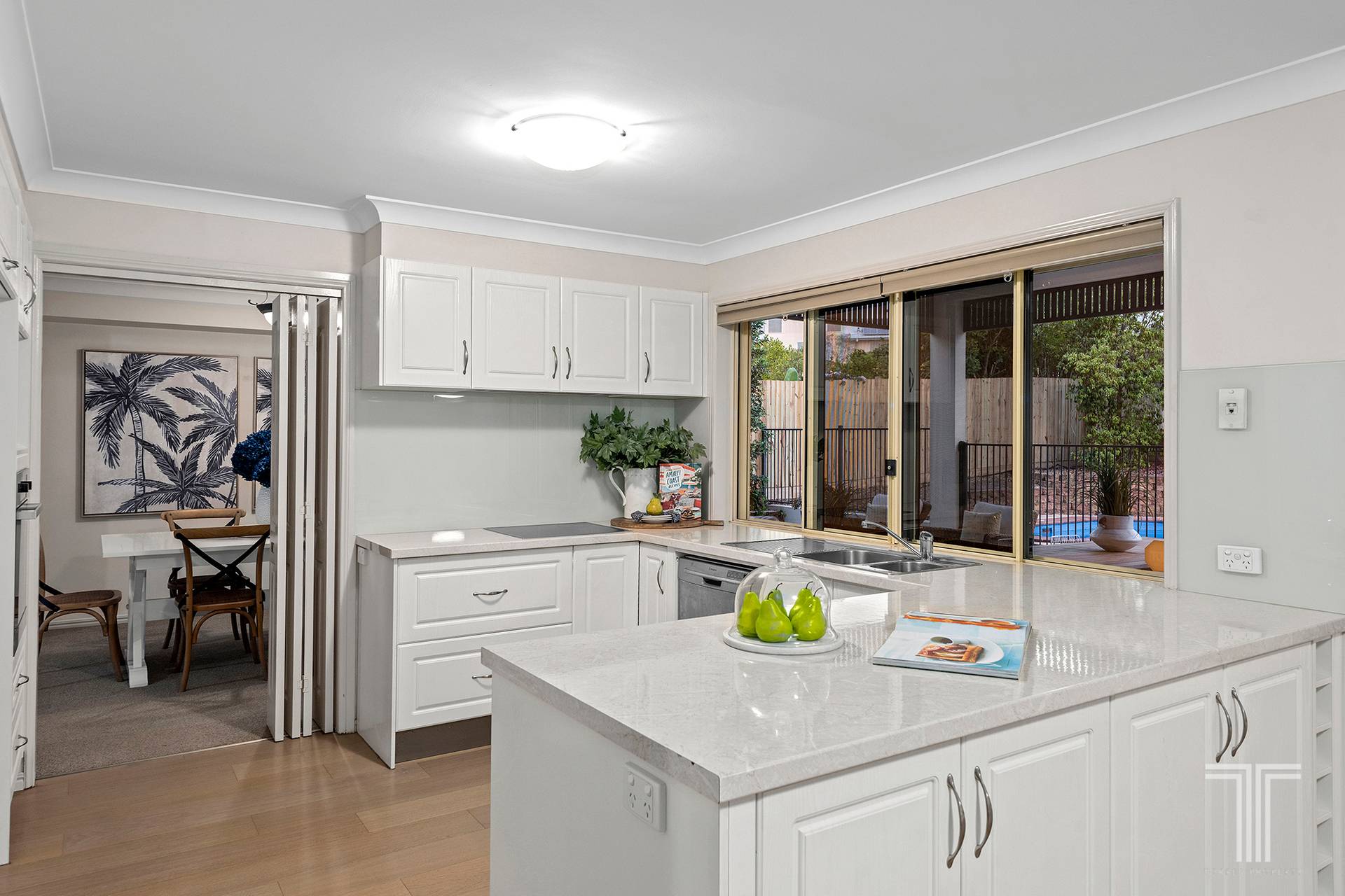Boasting exquisite flow, the grand interiors extend across formal and informal living and dining spaces, presenting plenty of room to relax and host guests indoors. The bright, airy kitchen anchors these separate retreats and features a practical design, including large wraparound benchtops and stainless steel appliances.