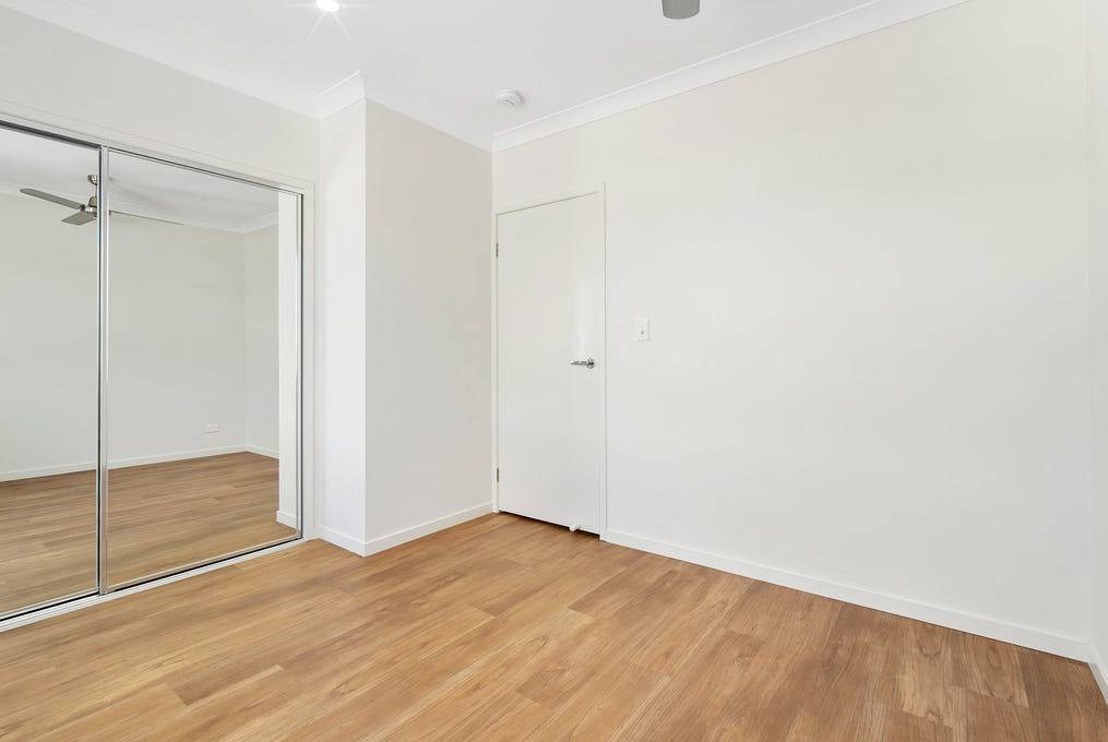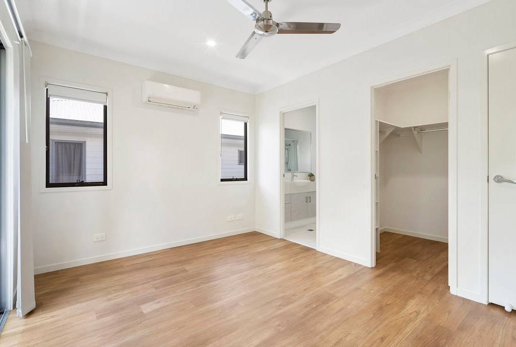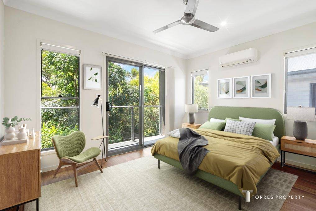 Beautifully crafted stairs lead you to the sleeping quarters. Luxury vinyl plank flooring provides a low-maintenance and allergy-reduced sleeping environment. Each of the three bedrooms is well-sized and features built-in robes, quality blind fittings, and ceiling fans. The air-conditioned master bedroom offers a walk-in robe, an ensuite, a ceiling fan, and picturesque views from the balcony. The junior bedrooms are equally spacious and conveniently accessible to a large family bathroom equipped with a separate shower and bath.