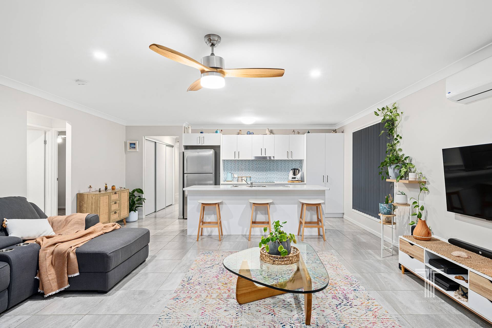 The tiled living and dining area reveals a spacious, open layout, creating a seamless connection to the outdoor retreat and stunning kitchen with stone benchtops, a breakfast bar, feature splashback and ample quality cabinetry.