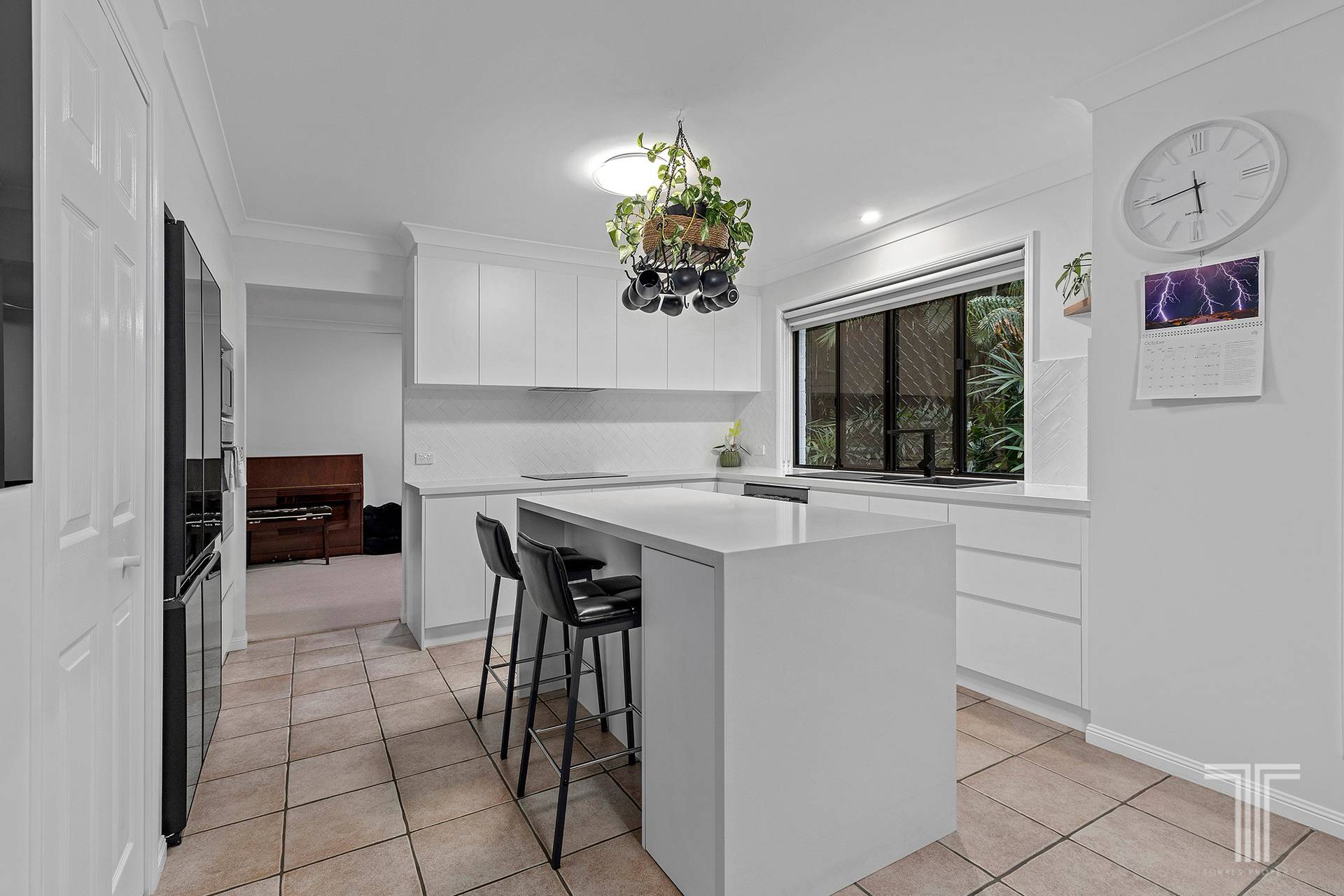 Adorned with a sleek white design and brand-new appointments, the kitchen forms a culinary showpiece with 40mm double waterfall benchtops, soft-close drawers and a range of Electrolux and Fisher & Paykel appliances, including an induction cooktop.