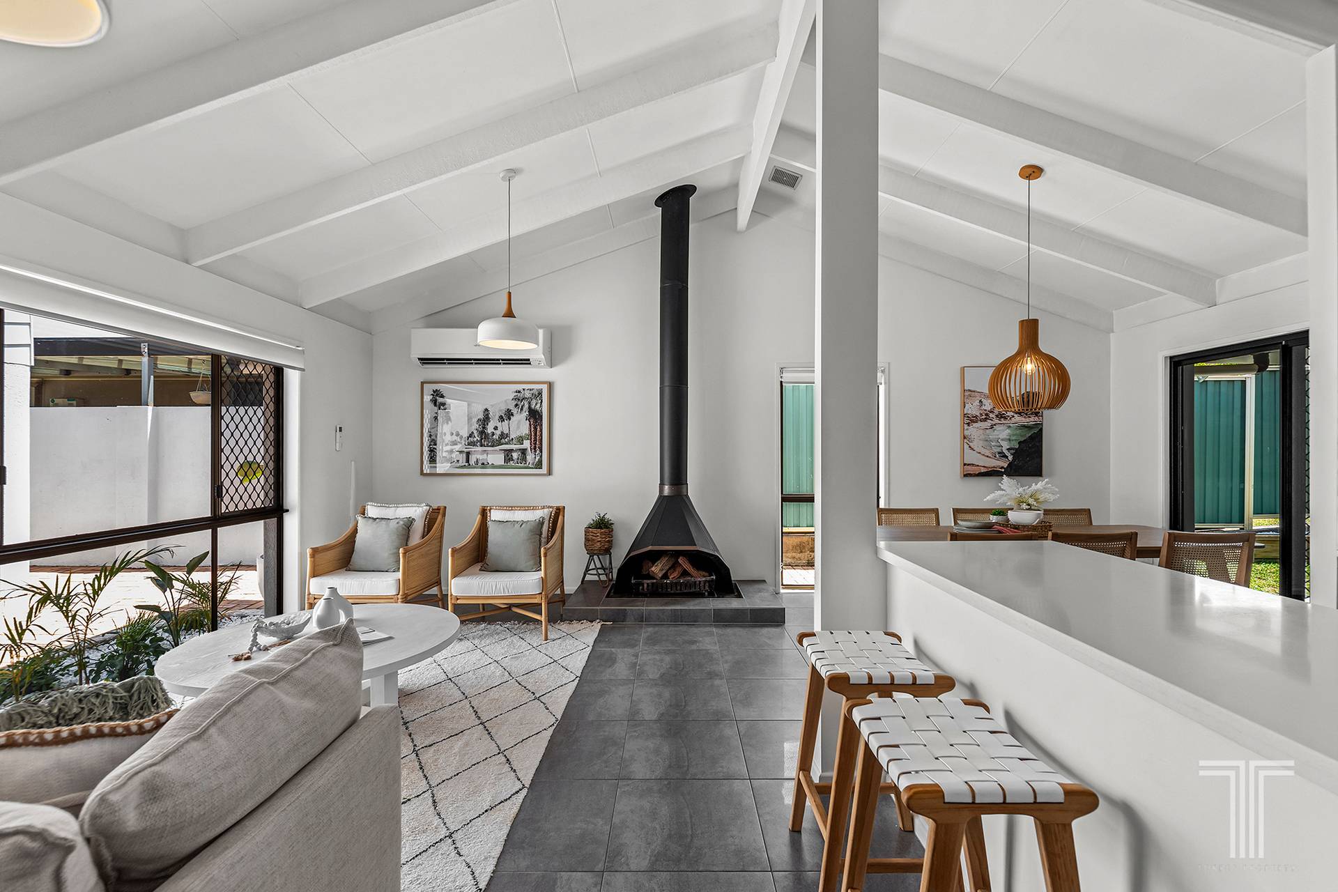Configured around a central lounge and dining area with gorgeous cathedral ceilings and an open fireplace, the lofty living space forms the heart of the home with a seamless connection and line of sight across the kitchen and alfresco entertaining zones.