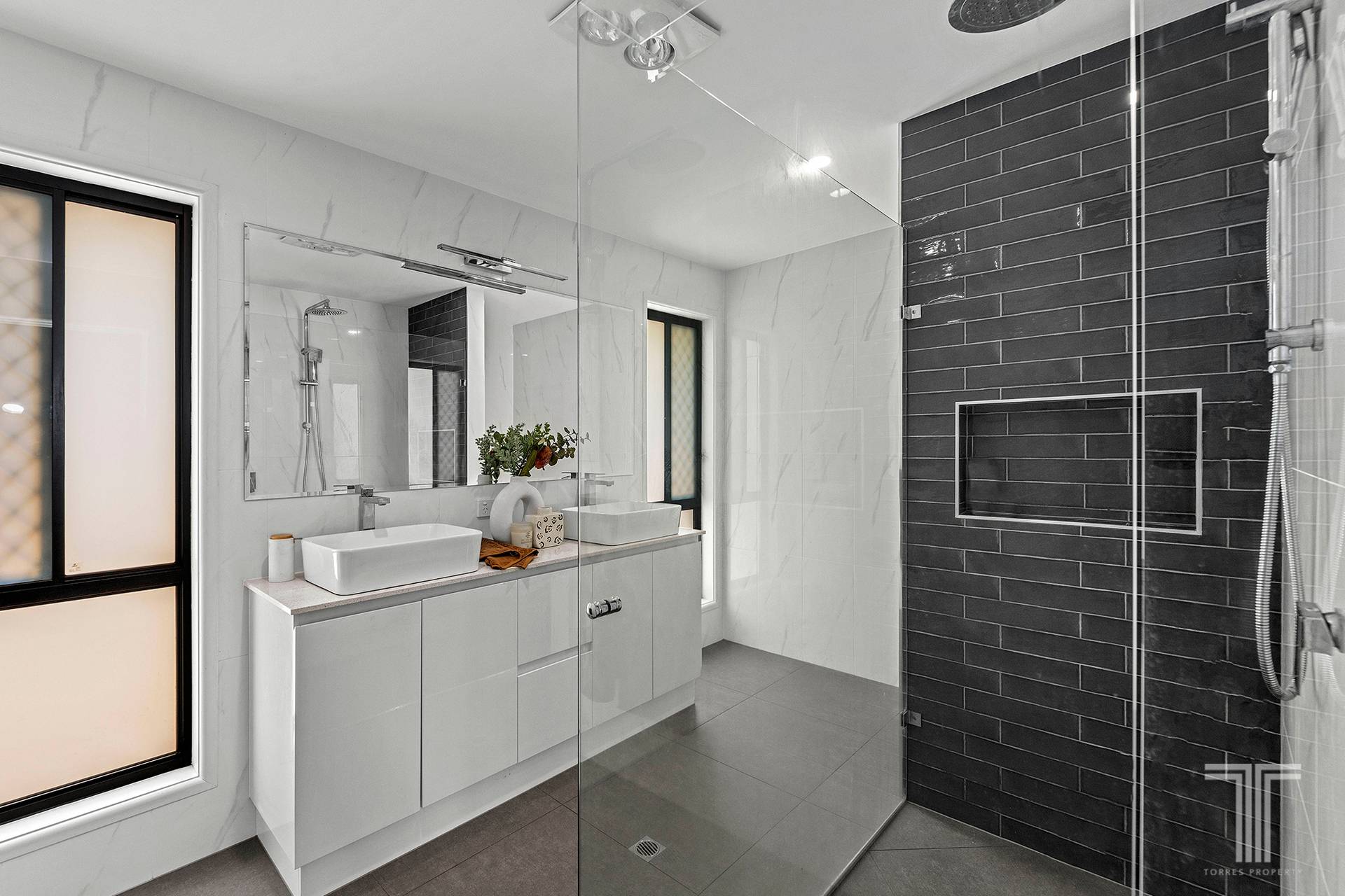 The house features four bedrooms with built-in robes and two bathrooms with stylish stonetop vanities and floor-to-ceiling tiles. The master suite presents a retreat for parents, revealing a massive walk-in robe and a dual vanity ensuite. The main bathroom is also well-designed with a shower, bath, separate toilet and an adjacent laundry.