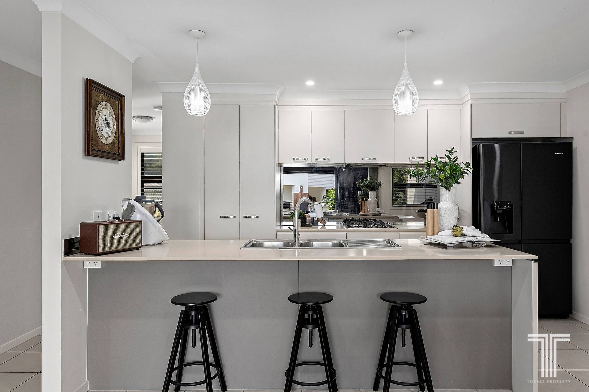 The mid-level forms the heart of this inspired home, with an open living/dining area basking in cooling breezes and flowing to the elevated balcony, delighting in tree-lined views across the pristine landscaping. A stylish stonetop kitchen with a gas cooktop and dishwasher also features on this floor, as does the spacious master retreat, providing privacy for parents with a walk-in robe and dual vanity ensuite.