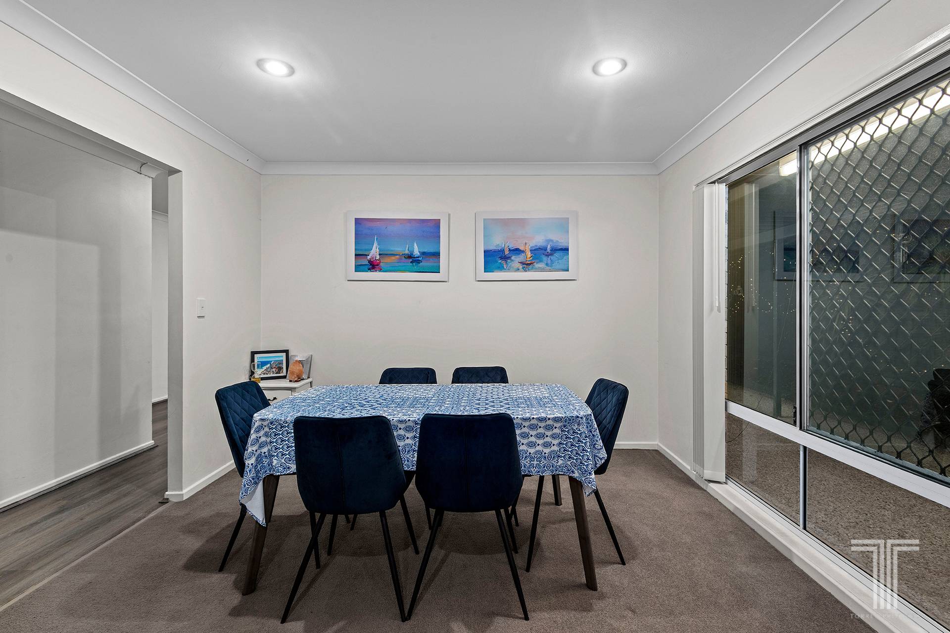 Flowing into the kitchen and dining area, this open family zone is appointed with large benchtops, ample cabinetry, and stainless-steel appliances.