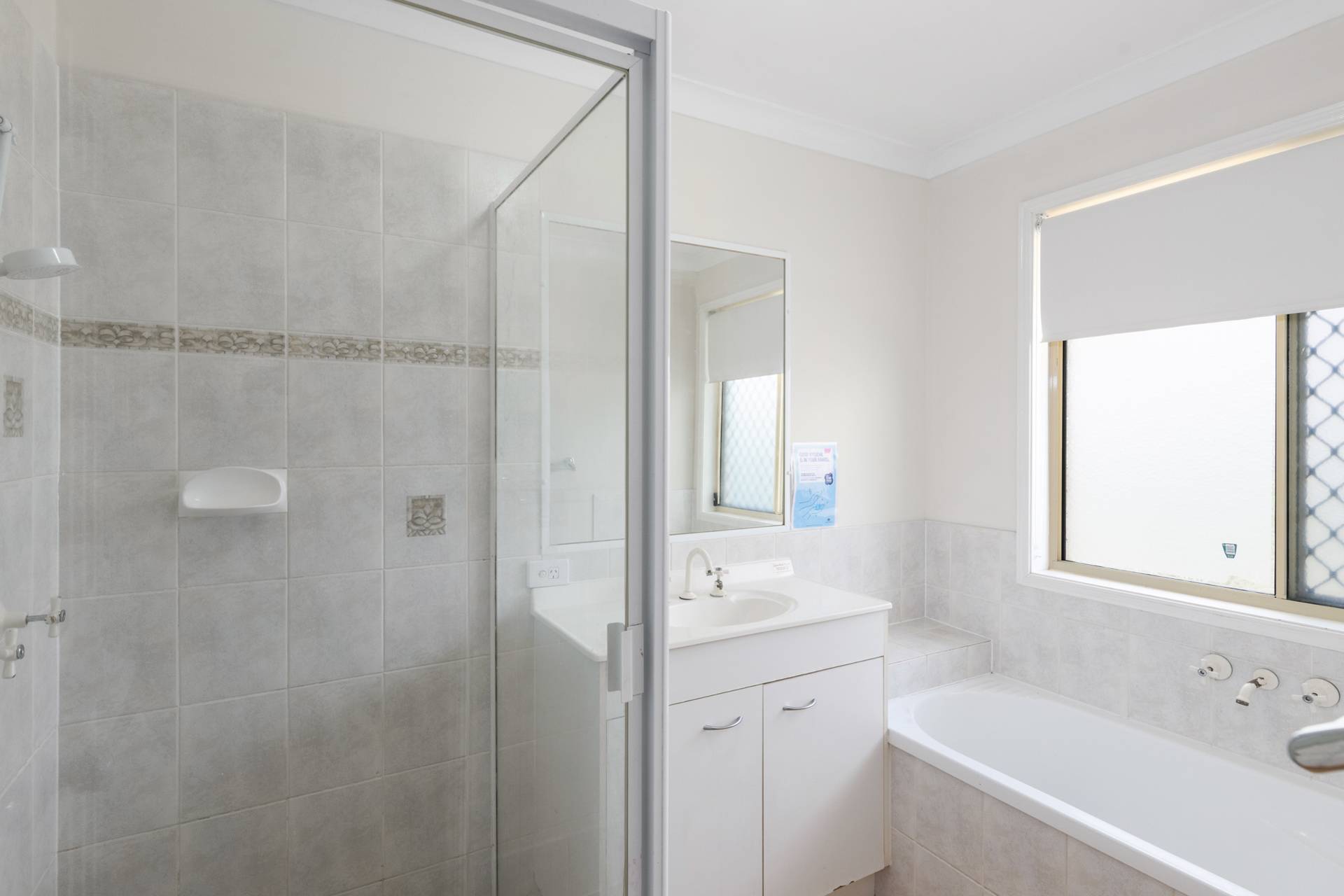 Two distinct living zones ensure families have plenty of room to unwind and come together. The lounge offers a retreat off the entryway, and the living and dining area features an open design with air-conditioning and an effortless connection to the central kitchen with large benchtops, stainless steel appliances and a gas cooktop.