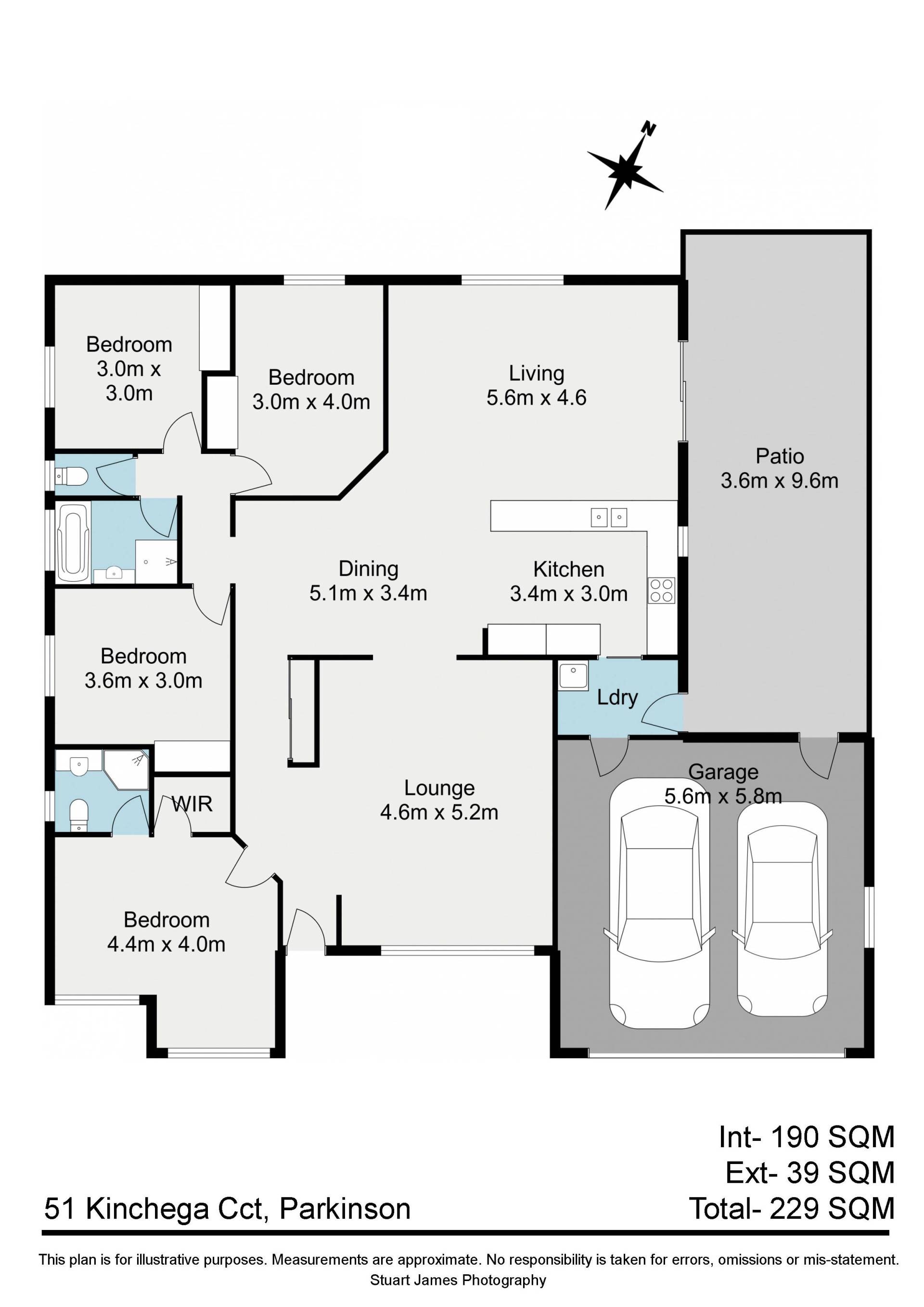 The functional floor plan continues with four bedrooms, two bathrooms, a laundry, and a two-car lock-up garage. The master suite is kept cool with air-conditioning and includes a walk-in robe and ensuite. The other bedrooms feature built-in robes and access to the main bathroom with a shower, bathtub and separate toilet.