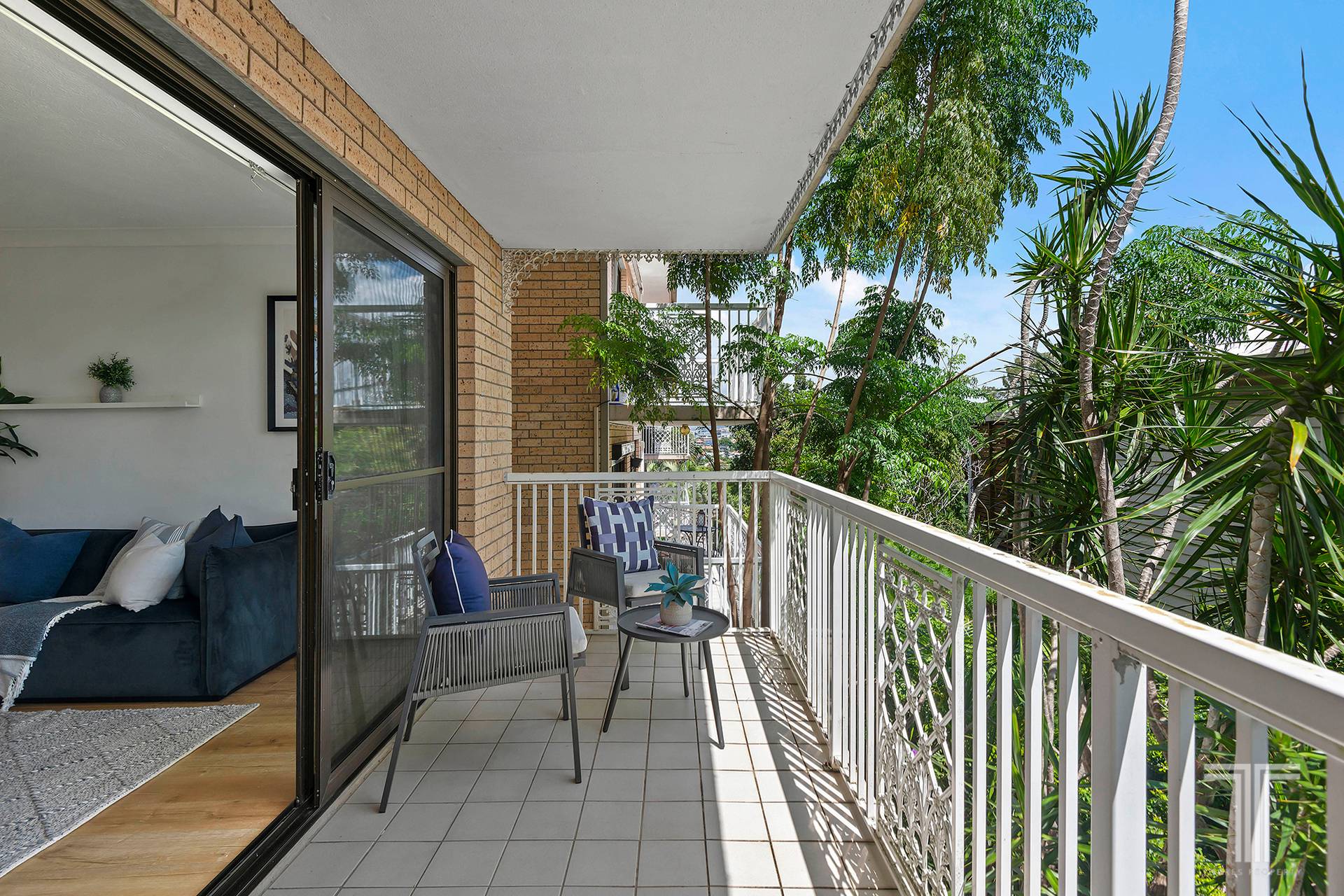 - Living and dining area opening to a wide, leafy balcony