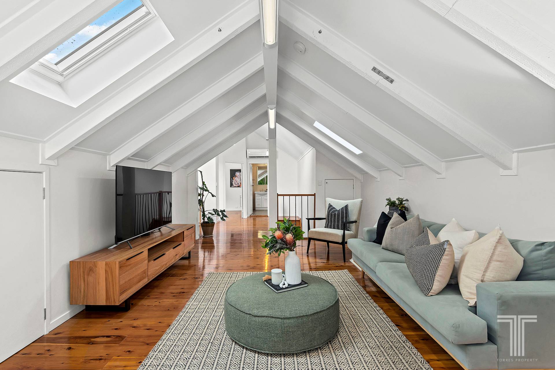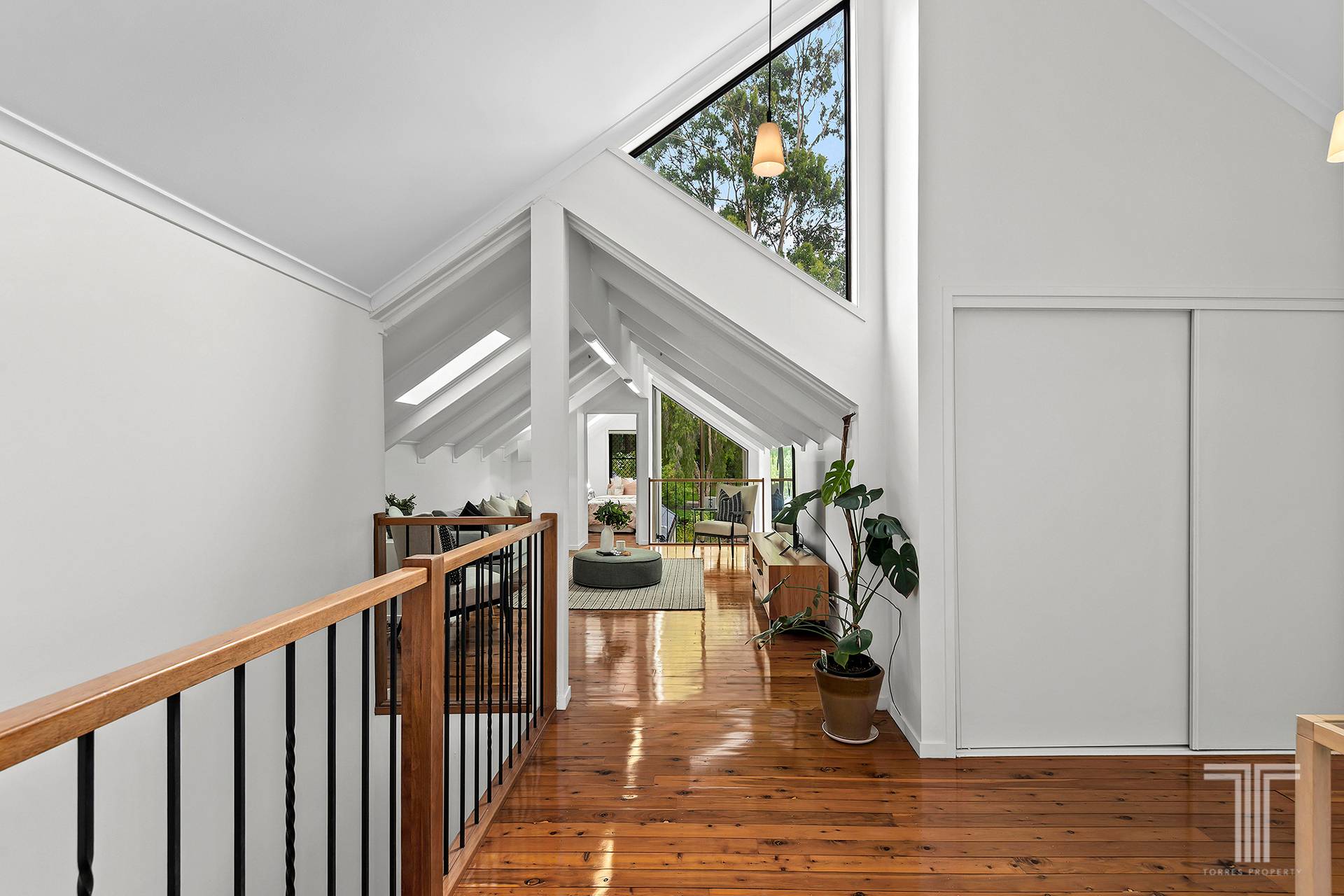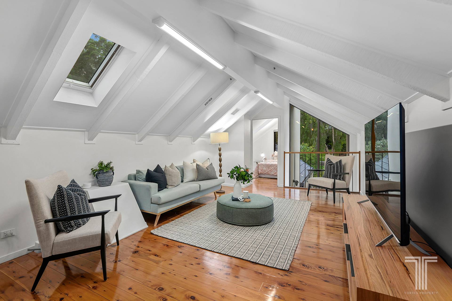Exquisitely renovated and composed with sculptural forms and adorned with beautiful timber floors, cathedral ceilings, skylights and air-conditioning, the sprawling house is suited to large families and effortlessly draws light, breezes and greenery indoors while maintaining a sense of comfort, warmth and privacy across the home.