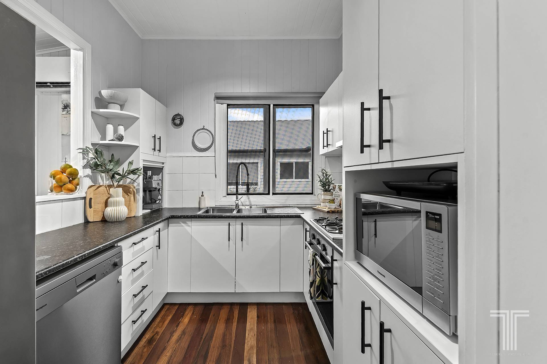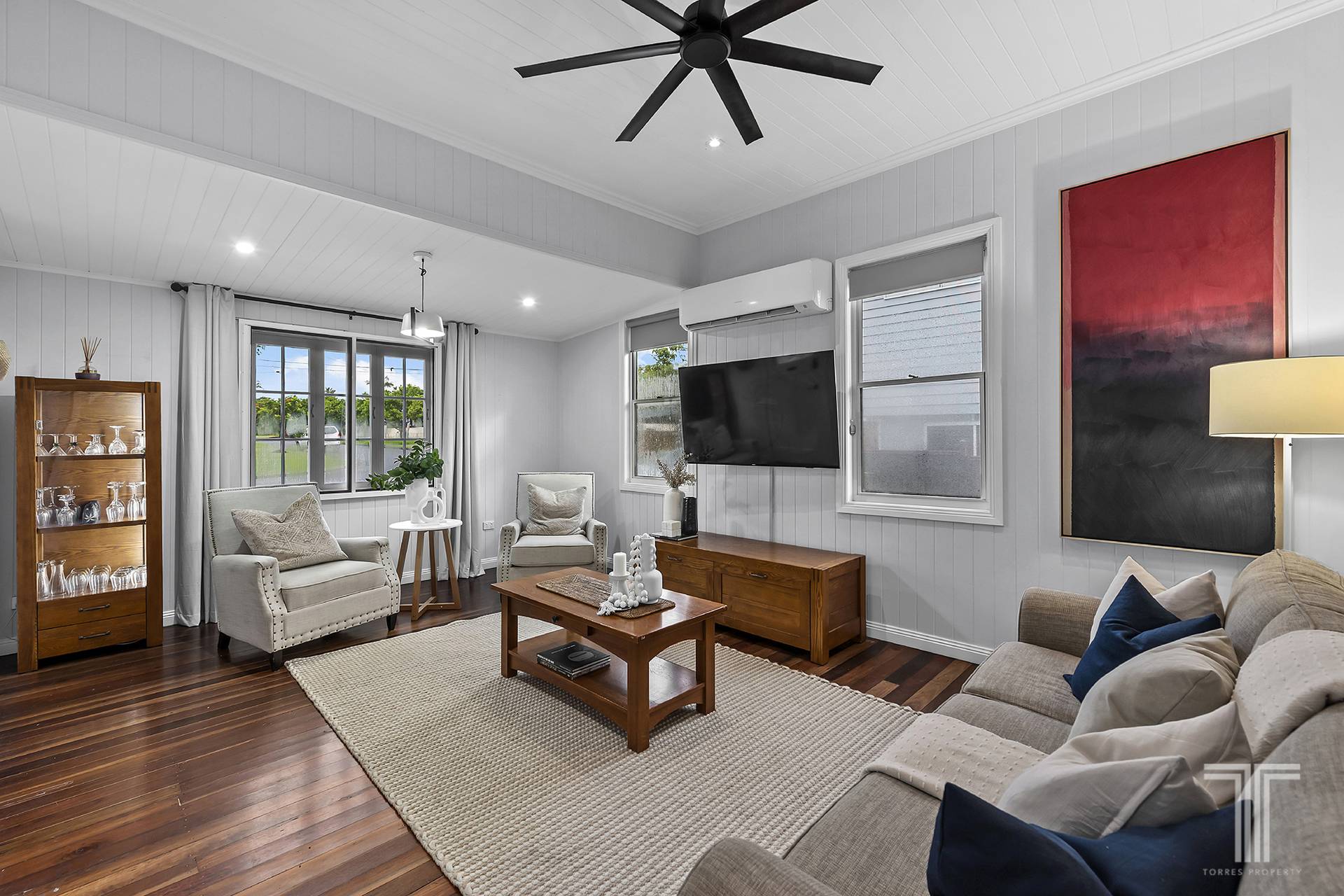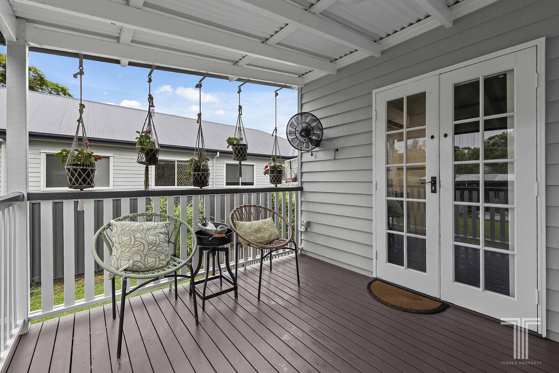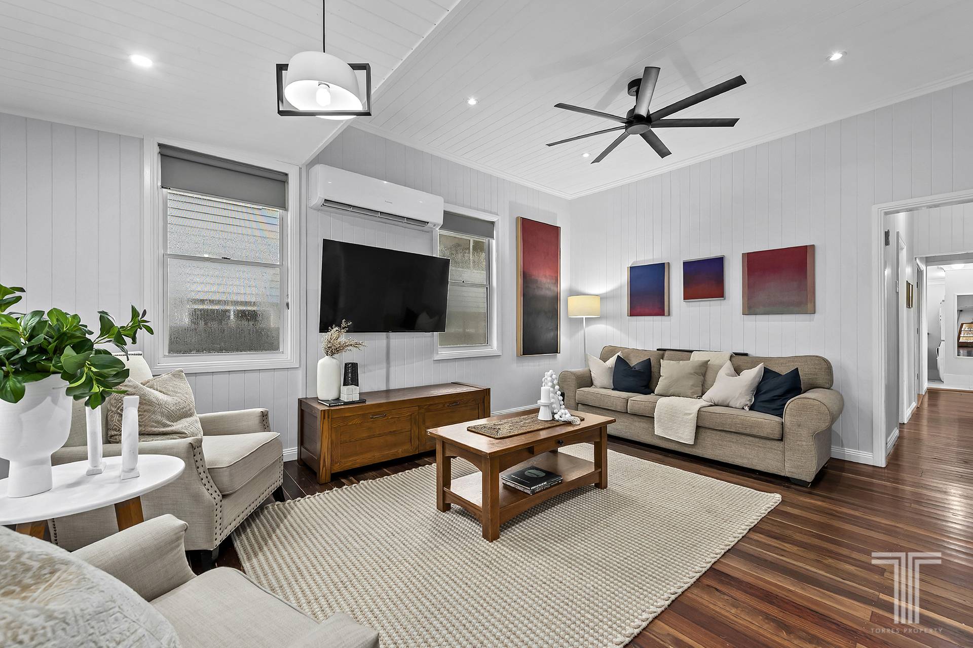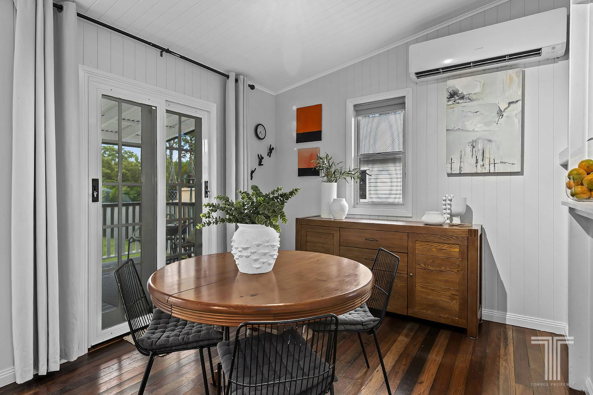 The house, a recently renovated Queenslander, exudes character with high ceilings, timber panel walls, and polished timber floors. The interior boasts modern fixtures in black and neutral colors, featuring 3 bedrooms with built-in robes, 2 bathrooms, and a kitchen equipped with a dishwasher, pantry, electric oven, and gas cooktop. The dining room opens to a rear verandah, providing a perfect setting for sunset drinks.