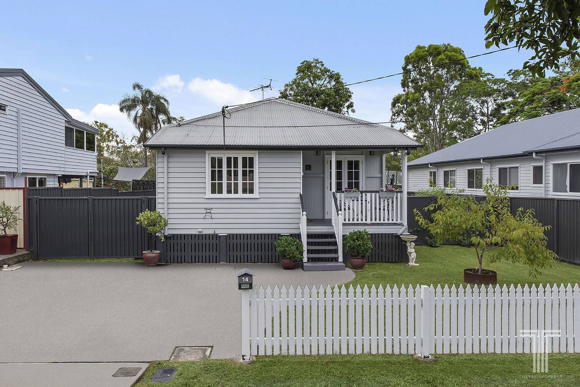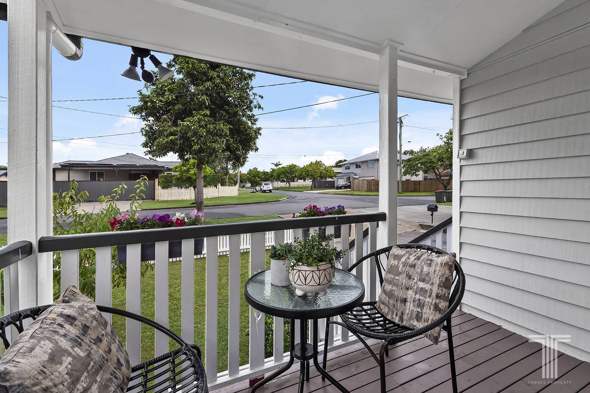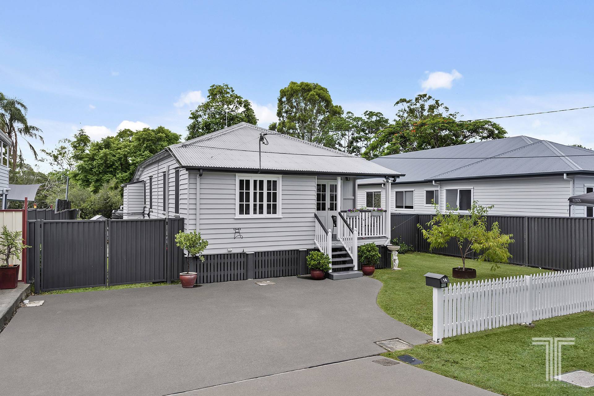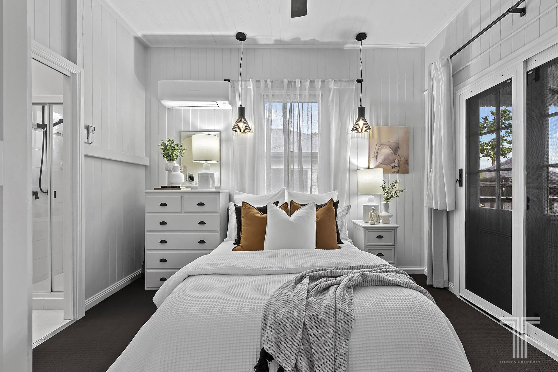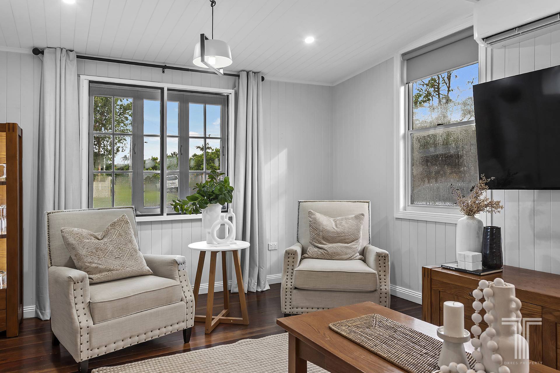 The house, a recently renovated Queenslander, exudes character with high ceilings, timber panel walls, and polished timber floors. The interior boasts modern fixtures in black and neutral colors, featuring 3 bedrooms with built-in robes, 2 bathrooms, and a kitchen equipped with a dishwasher, pantry, electric oven, and gas cooktop. The dining room opens to a rear verandah, providing a perfect setting for sunset drinks.