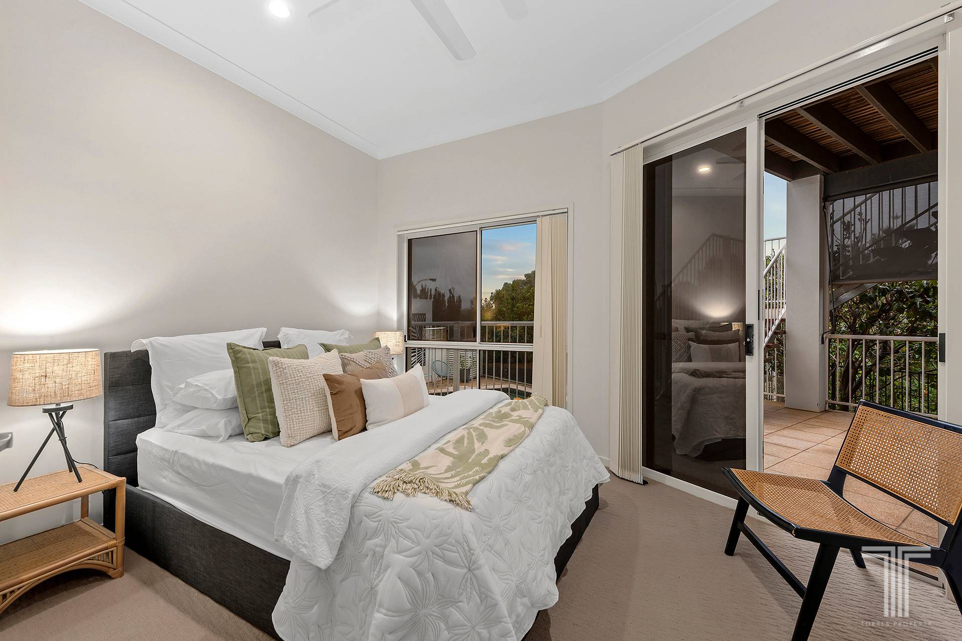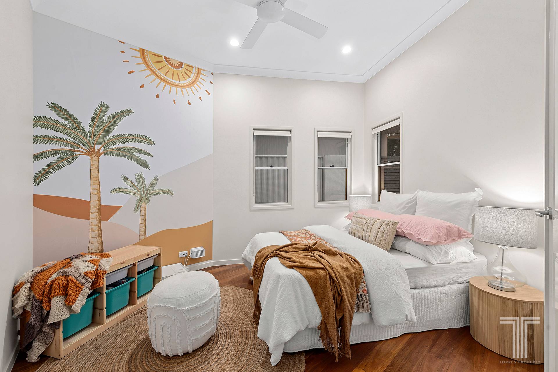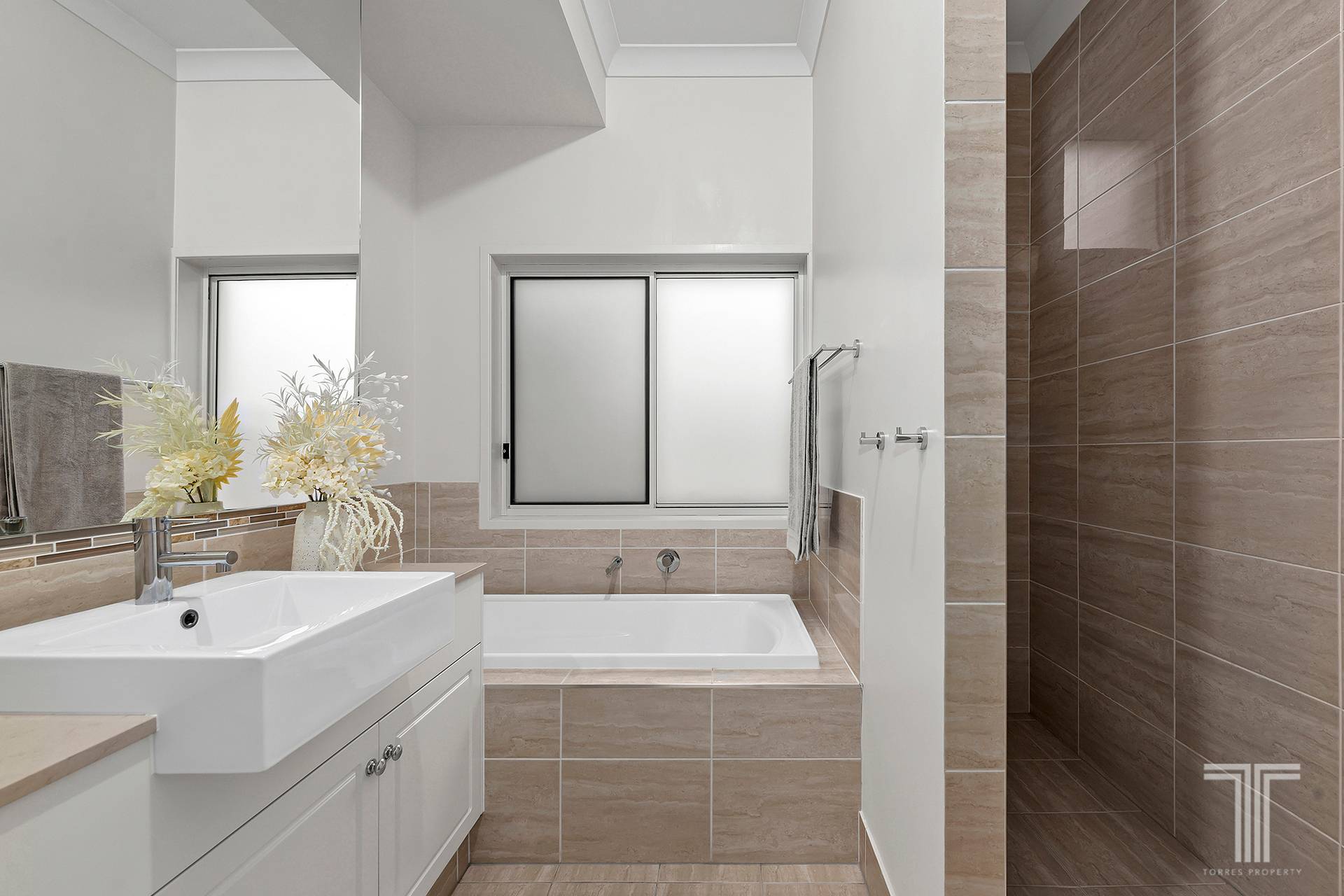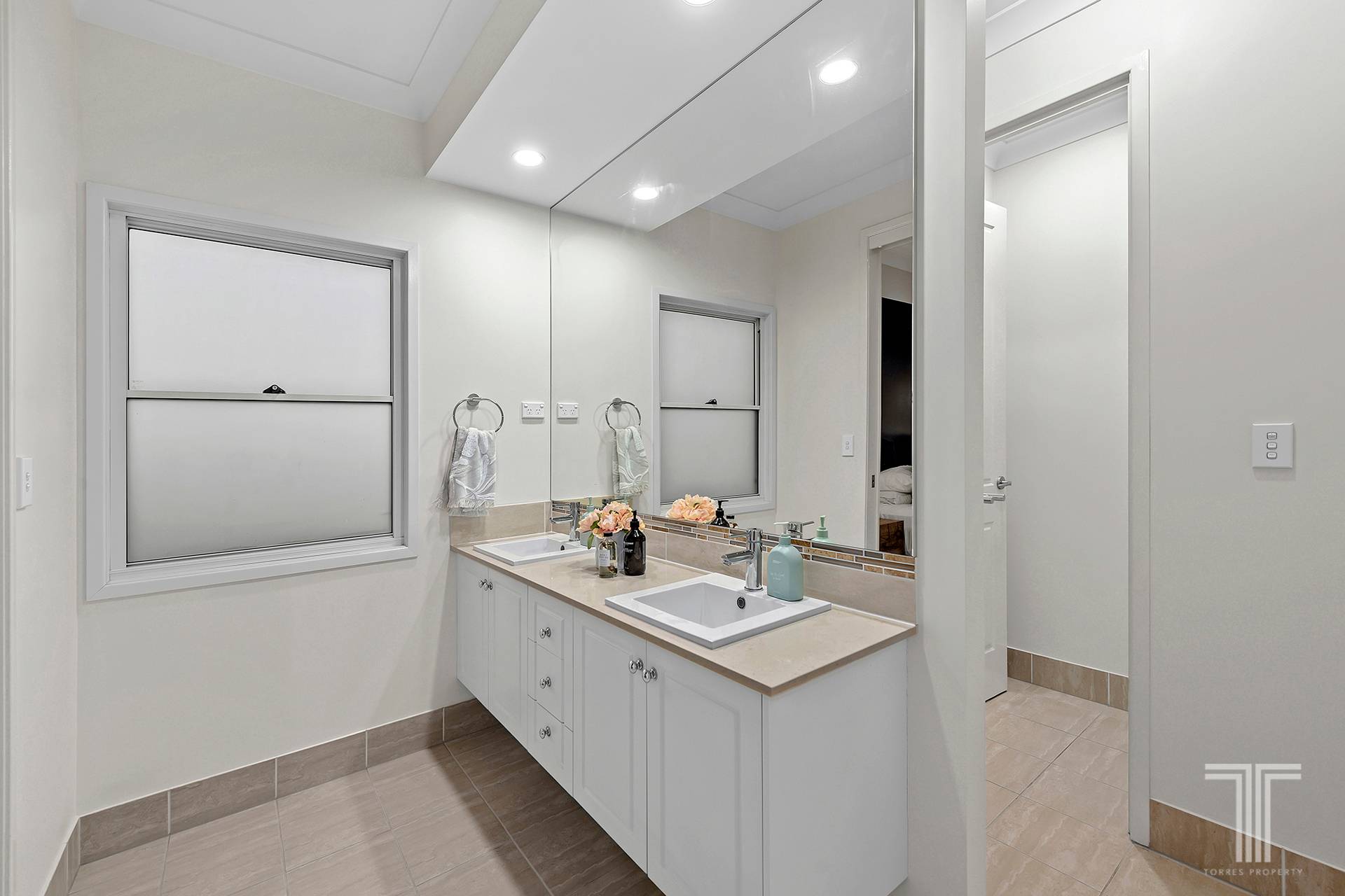 The lower floor includes three additional bedrooms, each with built-in robes. These rooms are serviced by a beautifully appointed bathroom with a walk-in shower, separate vanity, and toilet.