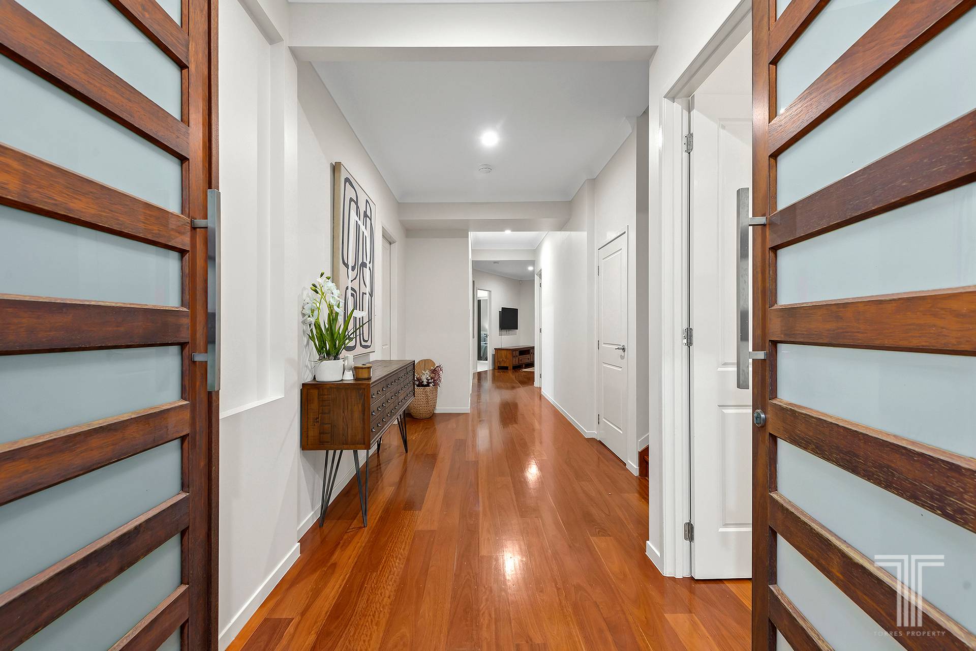 Stepping through grand double doors, you are welcomed into a realm of sophistication. The upper level features warm Finlayson blackbutt timber floors and 2.7m ceilings, creating an ambiance of elegance and comfort.