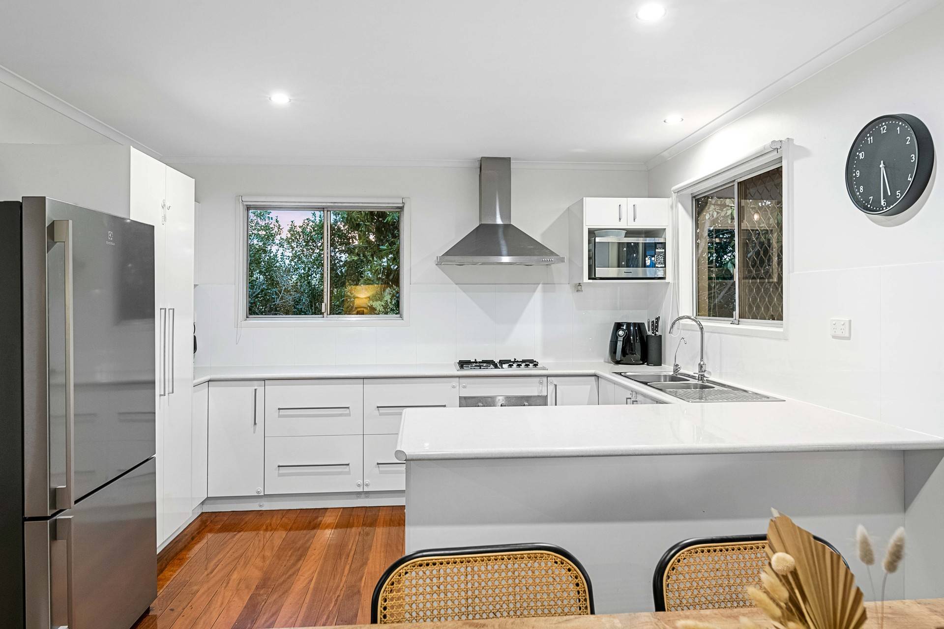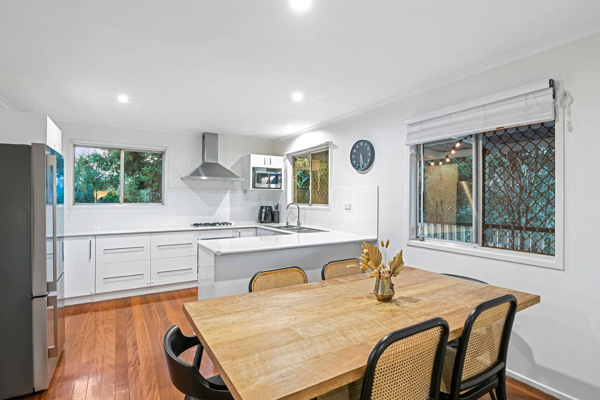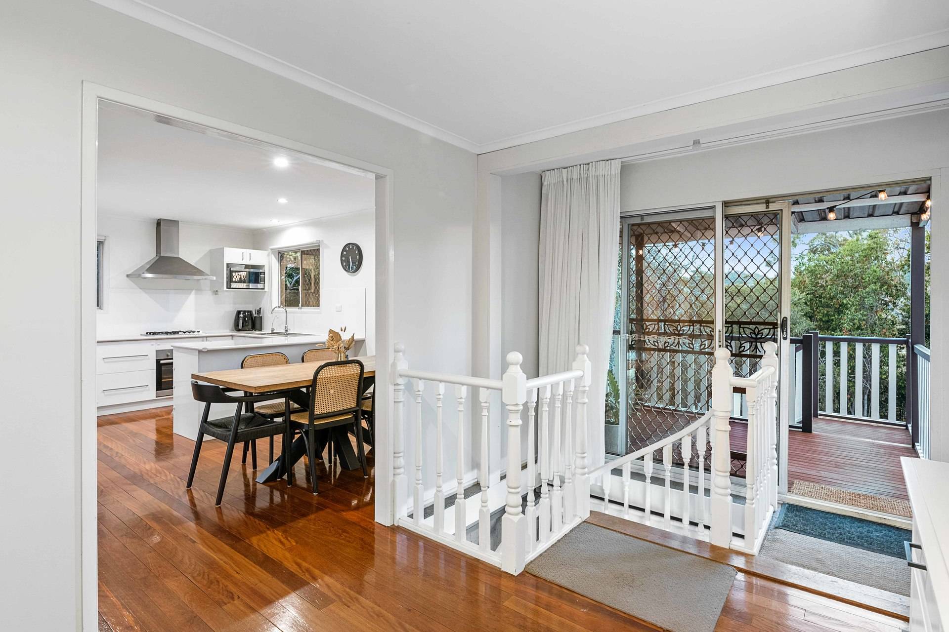 Timber floors adorn the upper floor, which flows across a sunroom, air-conditioned living room, and a kitchen/dining area with excellent cabinetry, stainless steel appliances and a gas cooktop.