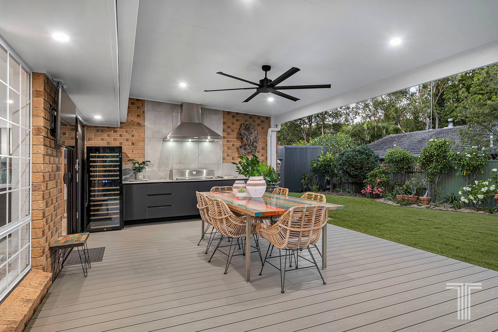 Forming a stunning centrepiece within the home, the modern kitchen has been redesigned to support seamless flow across the living room, family/dining area, and the new alfresco deck. Adorned with a waterfall benchtop, butler's pantry, Bosch dishwasher, Fisher & Paykel induction cooktop, and a 70cm pyrolytic oven, the resident cook has everything they need to prepare extraordinary meals.