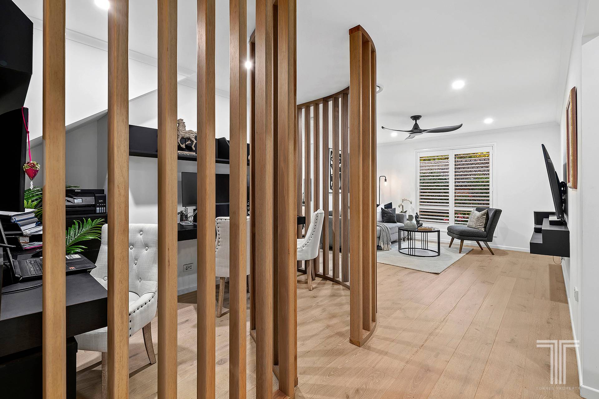 The layout continues with four bedrooms, two luxurious bathrooms, and a screened study, creating a designated space to work from home. Three bedrooms (including one with a study nook) are upstairs, and the master suite forms a sanctuary with a walk-in robe, shoe closets, and an opulent ensuite with a bidet, dual vanities and a double shower.