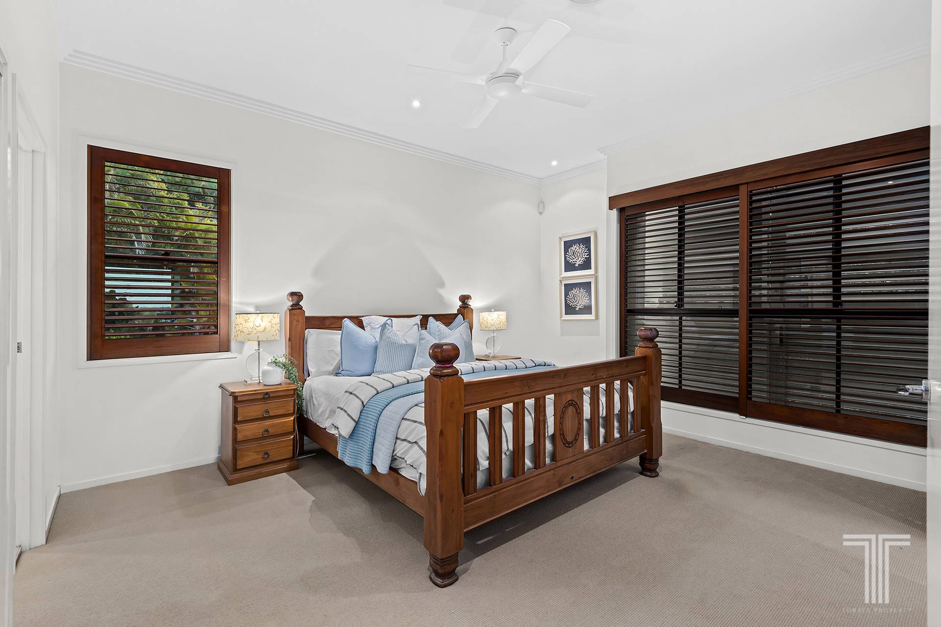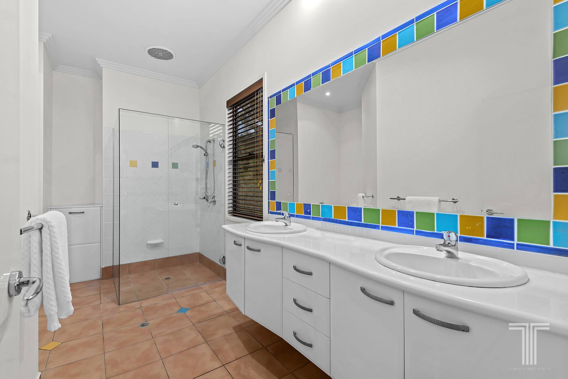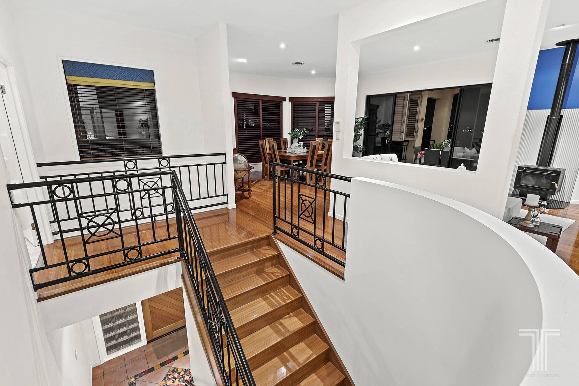 There are five bedrooms, three bathrooms and a laundry. The upstairs master suite reveals a private balcony, walk-in robe and dual vanity ensuite. A second bedroom features upstairs, and all three bedrooms downstairs extend to the rear patio.