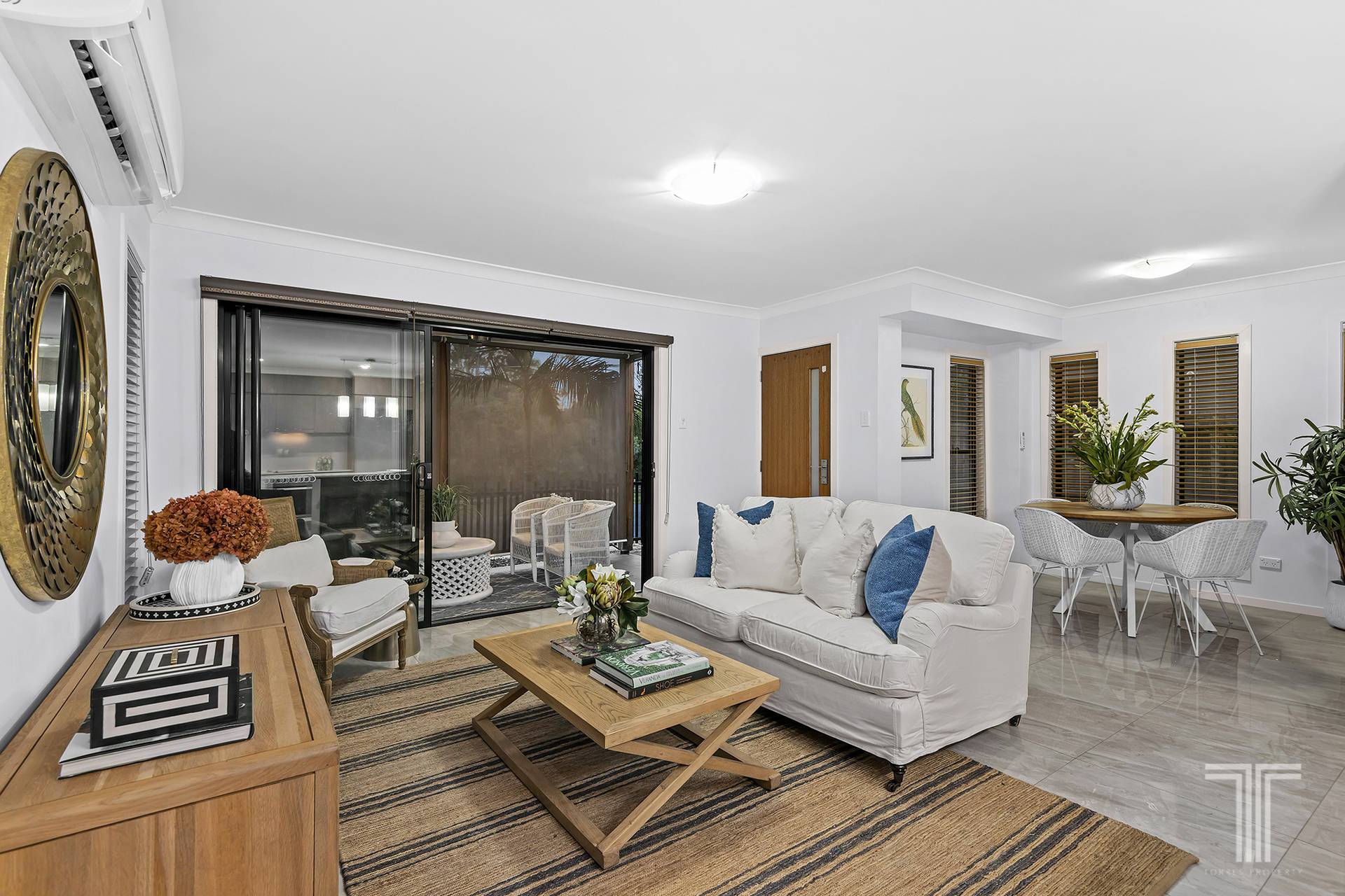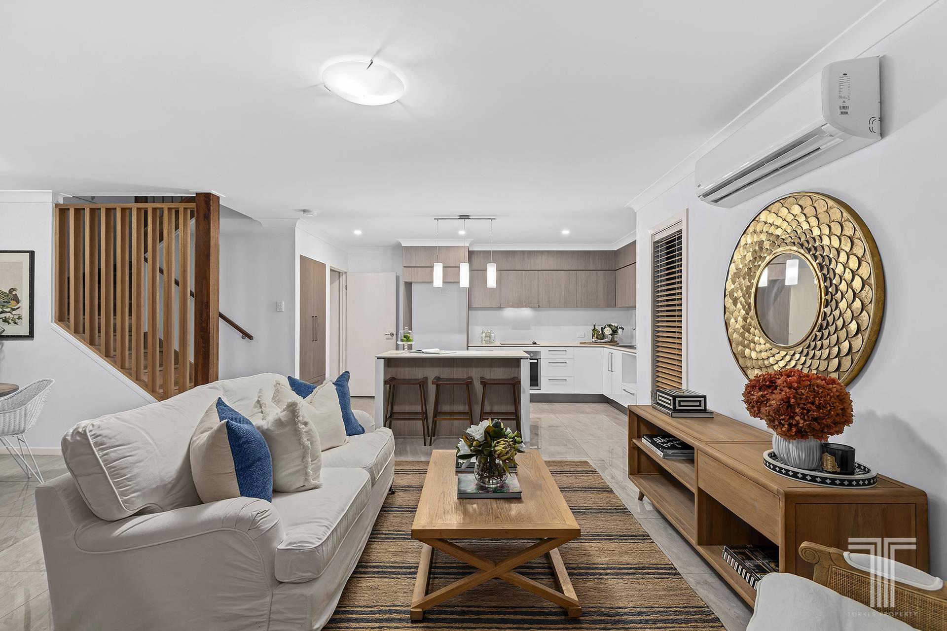 A private hideaway within an exclusive complex, the residence offers idyllic living with open interiors, outdoor entertainment space, and a low-maintenance design featuring modern finishes, stylish floorboards, sleek tiles and a wooden staircase.