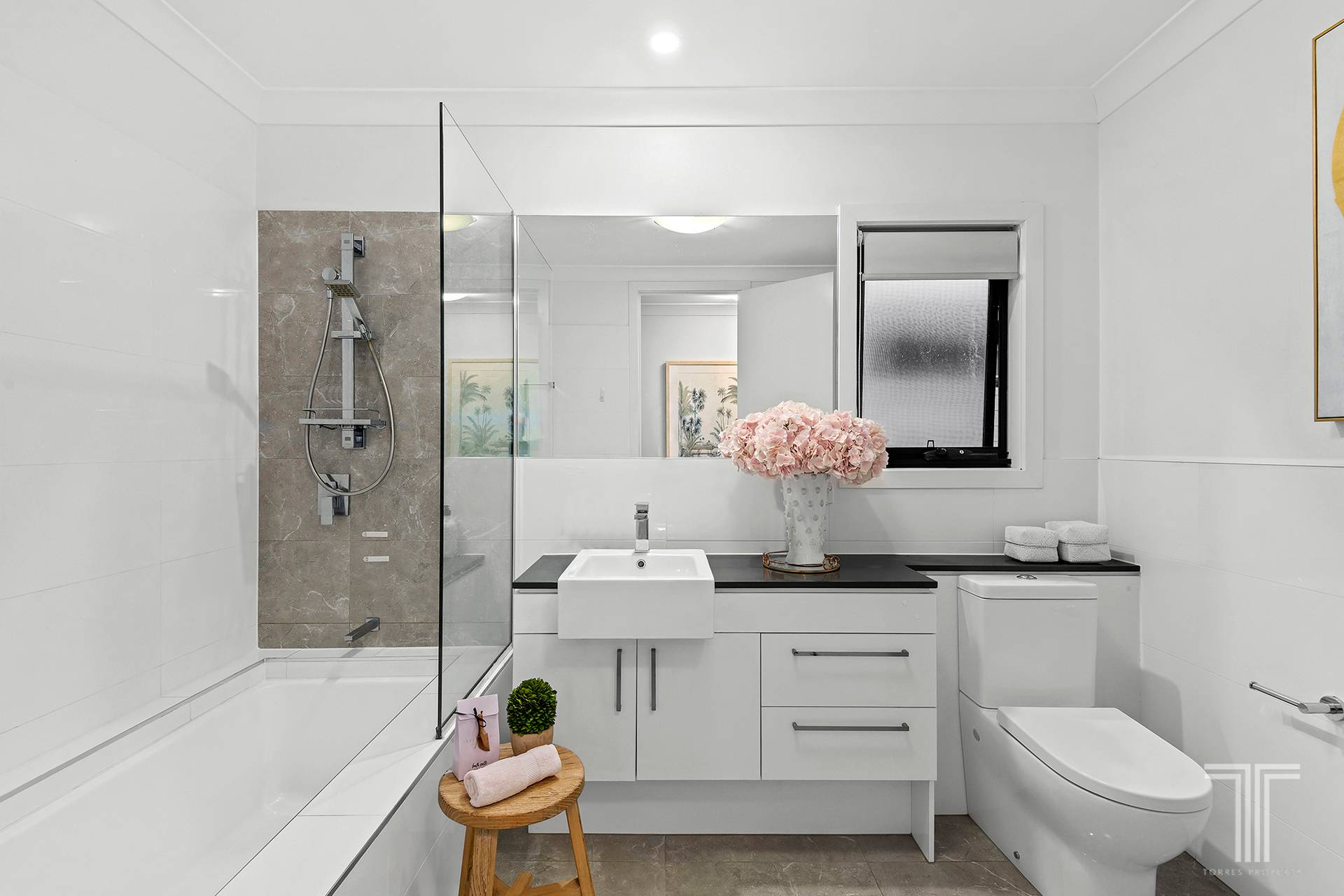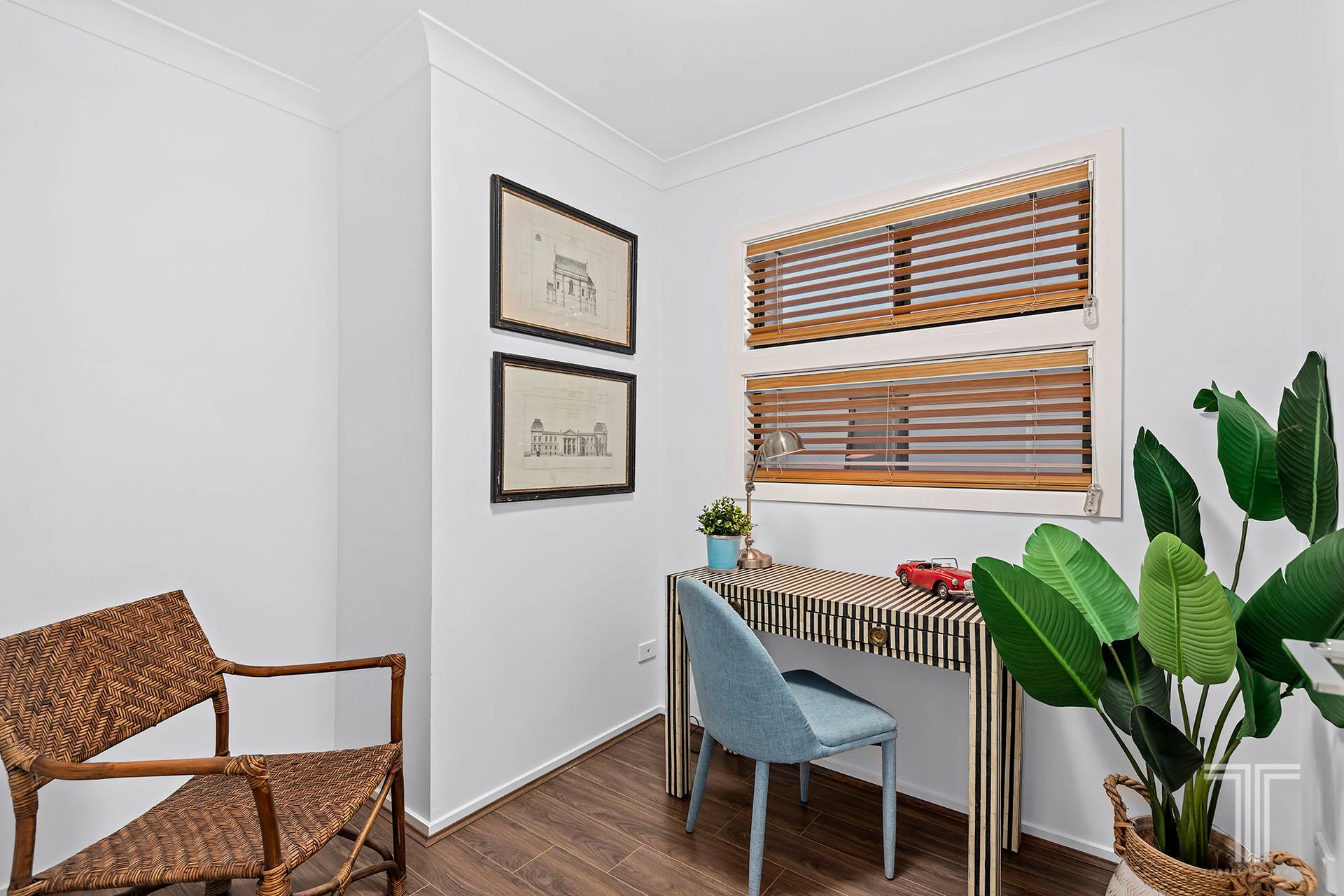 A study, three bedrooms, and two bathrooms are upstairs, and a powder room, laundry, and double garage feature below. All the bedrooms are generously sized with built-in robes, air-conditioning and ceiling fans, and the master includes a walk-in robe and ensuite.