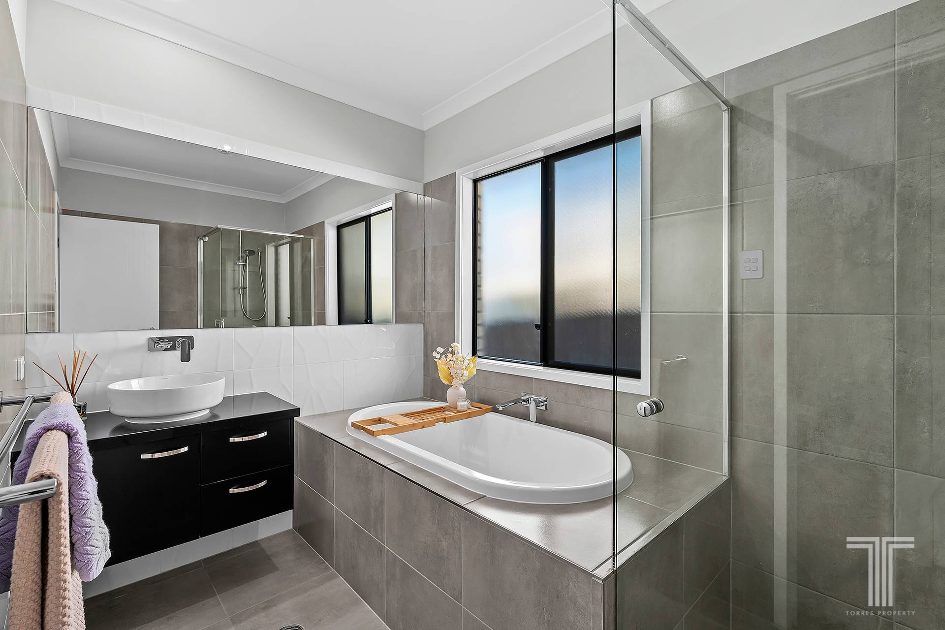 Four bedrooms accompany two bathrooms, a laundry, and a double garage with epoxy floors. The master suite boasts a private position and has been designed with a walk-in robe and an ensuite adorned with feature tiles and a floating vanity. The other bedrooms have built-in robes and share the second bathroom with a relaxing bathtub and a separate toilet.
