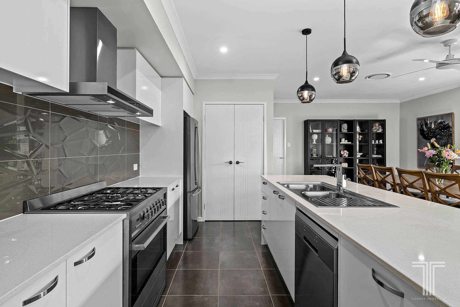 Designed for easy cooking and entertaining, the kitchen has been thoughtfully configured with Caesarstone benchtops, an oversized pantry and stainless steel appliances.