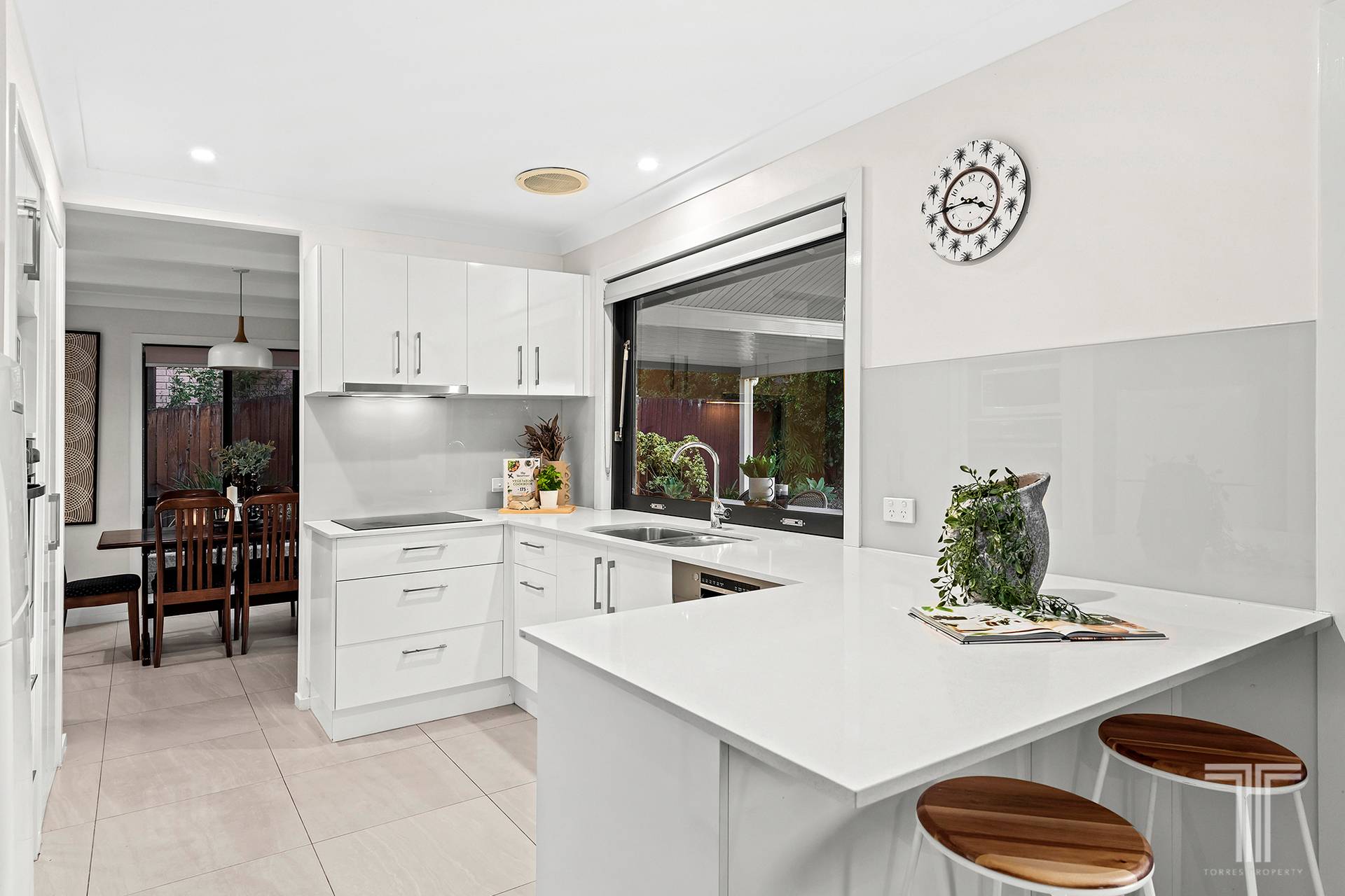 The central modern kitchen separates the dining and meals spaces and is well-appointed with stylish stone benchtops, Westinghouse appliances, an induction cooktop, and a servery window to the outdoor entertaining area.
