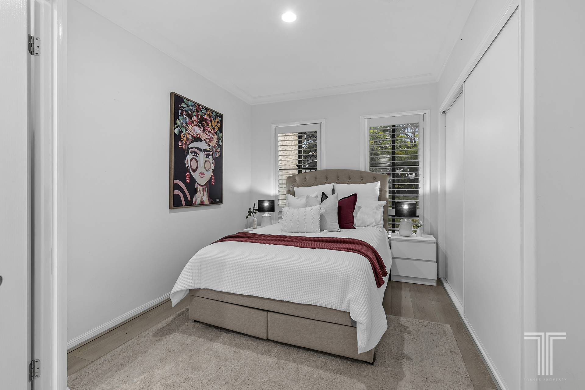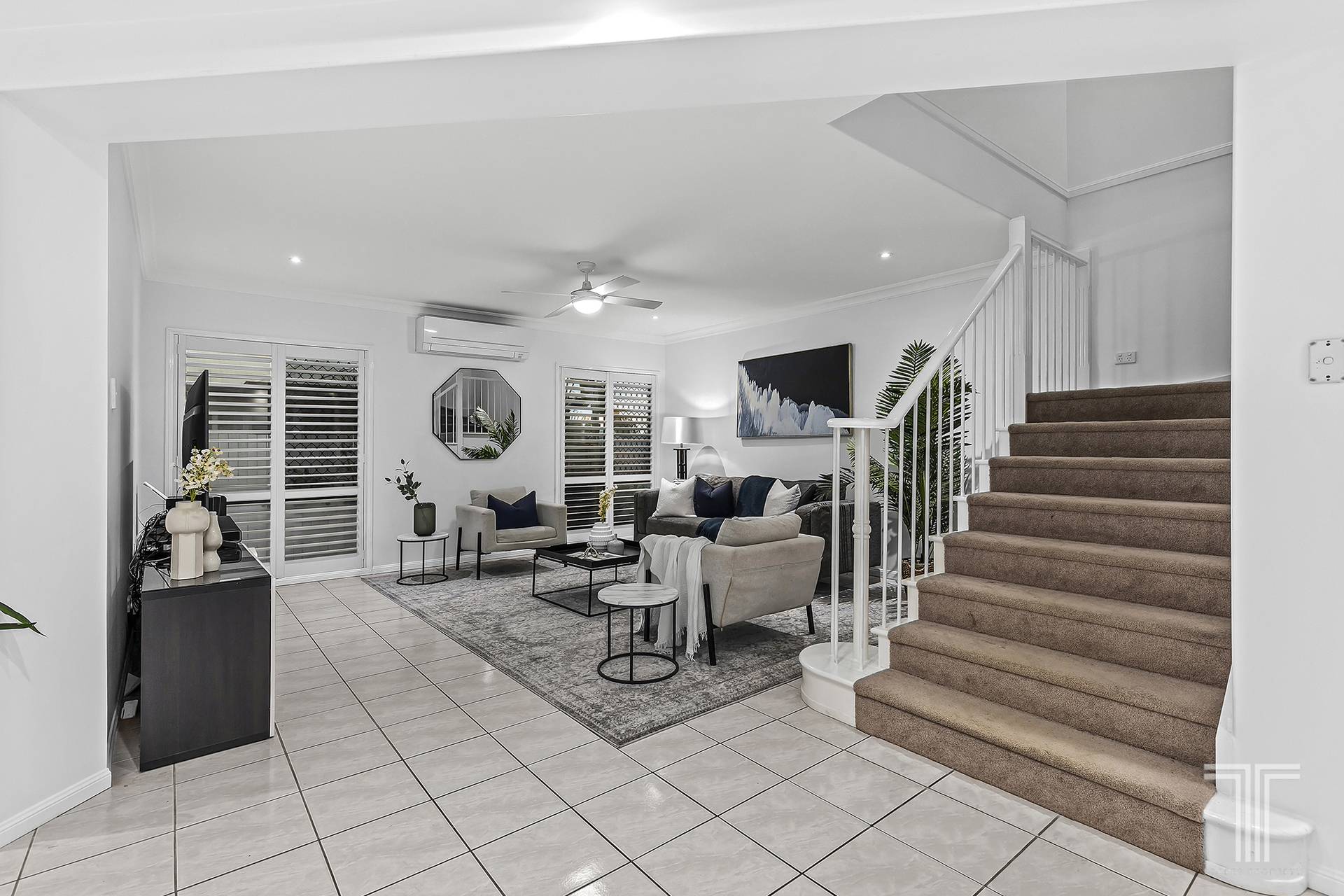 Stylish floorboards, sleek tiles, and plantation shutters adorn the interiors, which are filled with lovely leafy outlooks and beautiful northern sunlight. Flowing through the lounge, living, and dining areas, the ground floor boasts a thoughtful configuration and centres around the gourmet kitchen, which features a stylish black benchtop and superb appliances.